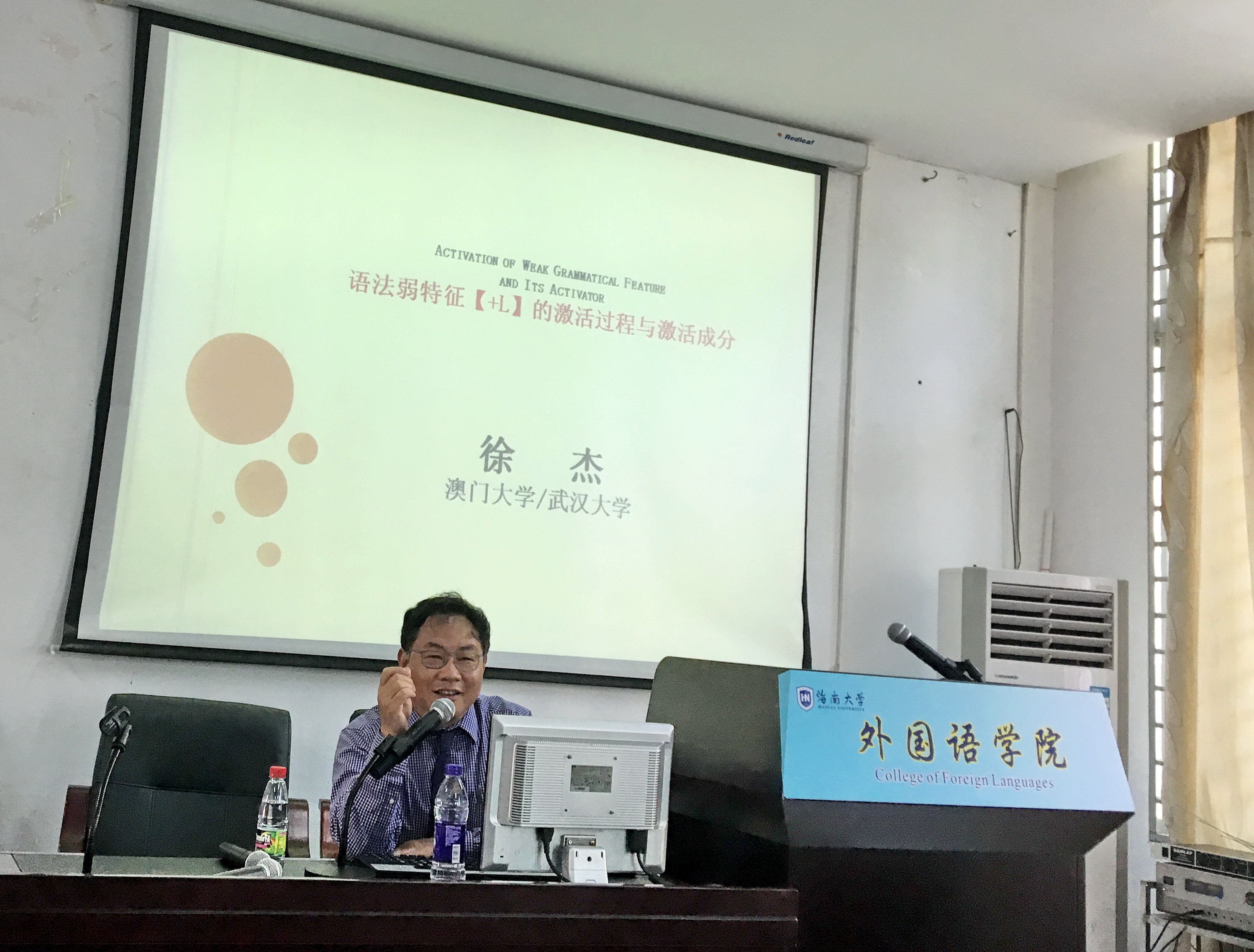 2018年4月2日下午三点半,bevitor伟德“南冥坛席”第三十八期学术沙龙在社科楼C-115如期举行。本期沙龙的主讲人为“语言学及应用语言学 ”讲座教授、来自澳门大学的徐杰教授,主题为“语法中弱特征[+处所]的激活过程与激活成分”,沙龙由徐贝贝博士主持。