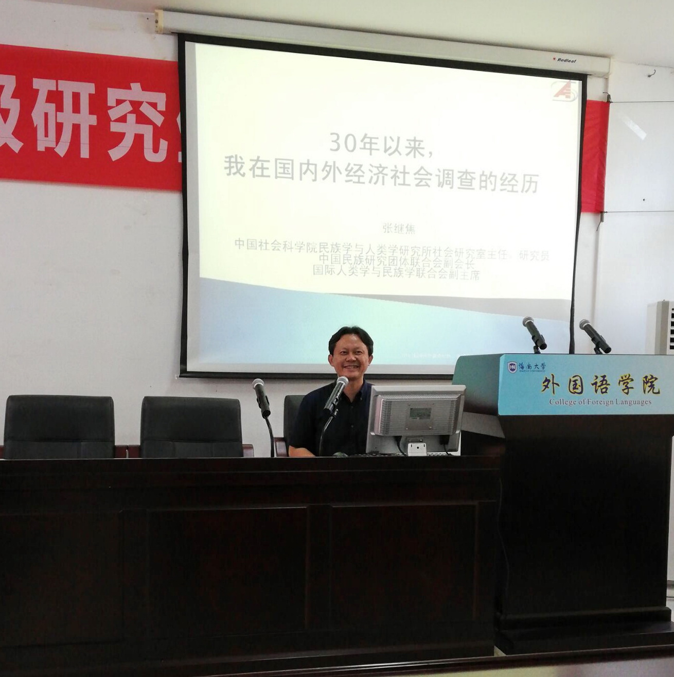 据悉,张继焦教授是社会学博士,中国社会科公司民族学与人类学研究所社会研究室主任,国务院特殊津贴专家,国际人类学与民族学联合会副主席、中国民族研究团体联合会副会长。涉猎社会学、经济学、人类学、民族学、企业管理学等多个学科,重点关注中国经济社会结构转型。到目前为止,发表中文文章200多篇,出版中文专著、译著等26部;用英文、日文、法文等三种外文发表论文10多篇,出版论著4本。曾访问过33个国家和地区,是一位国际型学者。 (摄影、撰稿:2018级文学硕士 方慧琴)