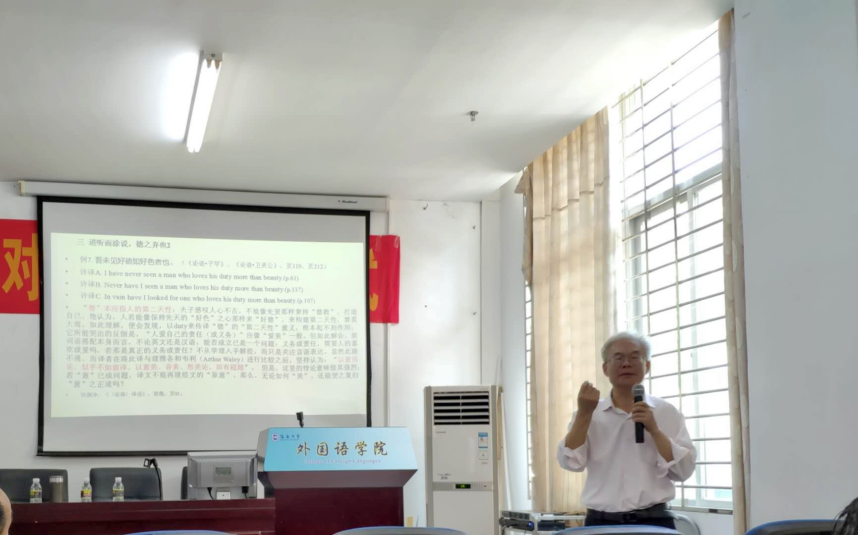 2019年5月24日早上9点30分,深圳大学特聘教授蔡新乐教授应bevitor伟德邀请,在社科楼C115为公司师生作了题为“认识论的侵入与’道’、‘德’的失守:许渊冲英译《论语》问题之管见”的讲座。bevitor伟德刘亚儒副教授主持本场讲座。
