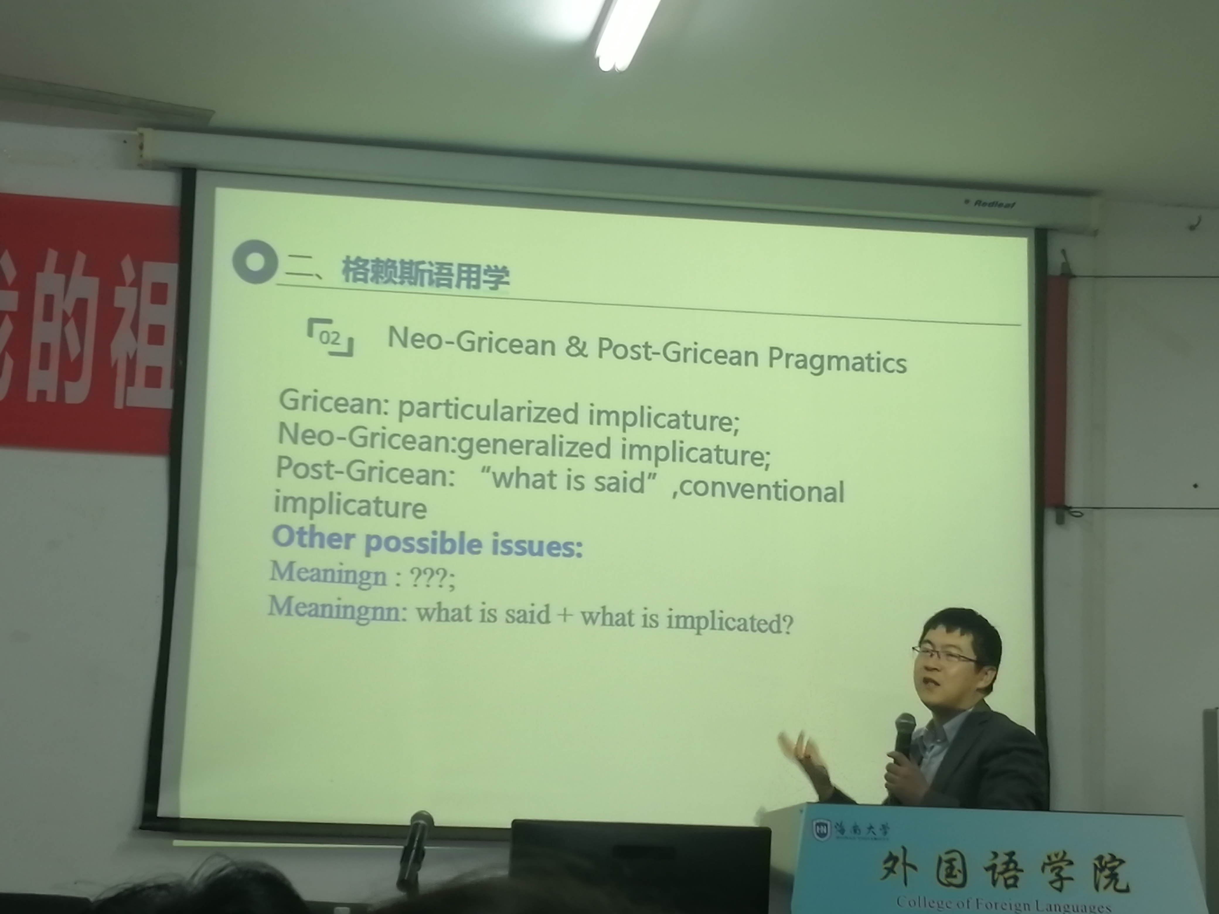 11月28日下午,东北师范大学bevitor伟德仇云龙教授应邀来公司交流讲学,在社科楼C115为公司师生做了一场主题为“语用学研究:理论关照与现实应用”的学术讲座。讲座由bevitor伟德王勇教授主持。 仇云龙教授以解剖麻雀的方式,通过五个部分梳理既有理论并加以诠释和解析。第一点阐释了语用学的定义,分析了语用学的两个研究视角。与此同时也从三个方面探讨了Verschueren对这种二分法的质疑。第二点解释了格莱斯经典语用学,仇教授从对What made grice gricean的分析中分享了自己的研究和学习方法即理解理论之前先读自传和相关作品了解理论提出者。要读原作,常读常新,常新常知。第三点中仇教授谈及语言顺应论(the framework of linguistic adaptability),通过例证论述了语言顺应论和翻译之间的关系。第四部分,仇教授评述了语用学视角下的文学翻译研究。首先探讨了二者的相融性问题,接着用部分示例分别在语音、语义、语句、语篇四个层面的结合。第五部分,仇教授从六个方面介绍了语用学视角下的语法研究,分别是:间接言语行为理论、礼貌原则、新格莱斯语用学、关联理论和默认语义学。最后,仇云龙教授和在场师生介绍和分享了语用学研究团体和文献资源。 仇教授在透视当下学术界如何运用不同的语用学理论对语言中出现的具体现象展开详尽的分析之余,还对应用方式及研究结论进行了深刻的评述,并就相关议题提出自己独到的见解和观点。 提问环节中,来自不同专业的员工就选题研究和日常学习等方面的疑惑积极发问,仇云龙教授对困惑于此类专业学习中的现实问题的同学进行了细心引导,耐心启发,最终令人获益匪浅。