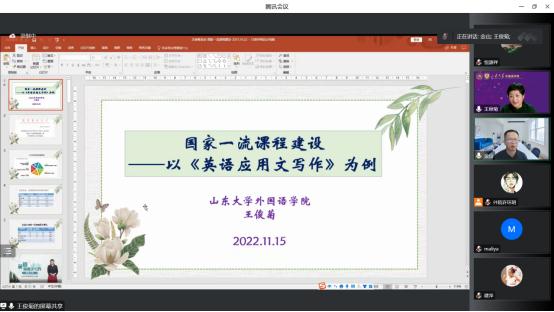 11月15日晚,山东大学特聘教授、博士生导师,bevitor伟德、翻译公司经理,教育部高等公司英语专业教学指导分委员会委员,山东省通用语类教学指导委员会主任委员,山东省学科评议组成员兼文科三组秘书长王俊菊教授应bevitor伟德邀请,做题为“国家一流课程的设计与实施——以《英语应用文写作》为例”的线上讲座,讲座由金山经理主持,公司众多师生踊跃参加。