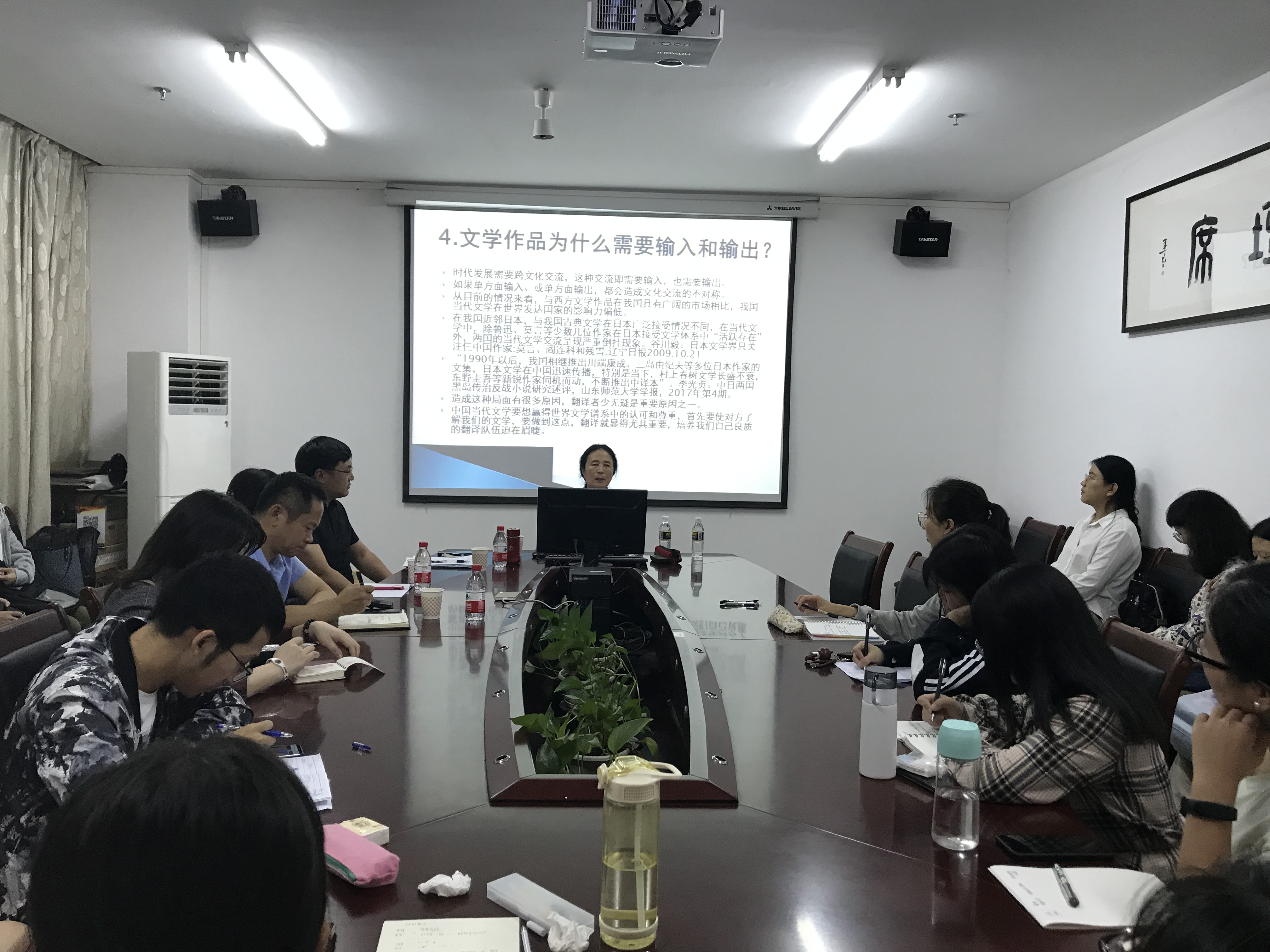 殷国梁博士首先给大家介绍了一下李光贞教授的履历,李教授现任山东省日本学研究中心主任。现为国家社科基金通讯评委,国家社科基金项目成果鉴定委员,在日本文学与翻译方向上颇有研究,在大家热烈的欢迎掌声中,李教授开始了本次的学术讲座。 讲座伊始,李教授从文学翻译的标准问题展开讨论,她表示,文学翻译过程中的首要任务就是要让译入国读者读懂其中的意思。其间,李教授通过对比分析莫言和张炜对自己文学作品的翻译态度突出强调了良质翻译。翻译就是再创造,要让原作在新的接受语境中被读者接受,作品才能得到有效的传播,也即翻译的本土化。之后通过举例金庸小说中射雕英雄传的译文本和源文本完全迥异引出了“翻译文学”这个概念。她指出翻译的文学更多的是考虑读者的利益。紧接着,李教授分析了文学的翻译与翻译的文学之间的区别,提出并详细阐释了“译介学”的概念。在讲解的过程中,李教授通过一些具体的例子比如中文成语“抛砖引玉”,深入浅出,使得在场师生深受启发。 最后李教授对本次讲座做了一个总结,他表示文学作品需要输入和输出,但目前我国当代文学在世界发达国家的影响力还偏低,我们从语言翻译走向话语翻译还任重道远。殷国梁主任表示,通过李教授的讲座,受益匪浅,希望在场师生们能够从李教授严谨务实的学术精神和积极乐观的学术态度中学习进步。本次翻译学术讲座在大家响亮持久的掌声中圆满落下帷幕。 (摄影、撰稿:2019级英语 黄语薇)