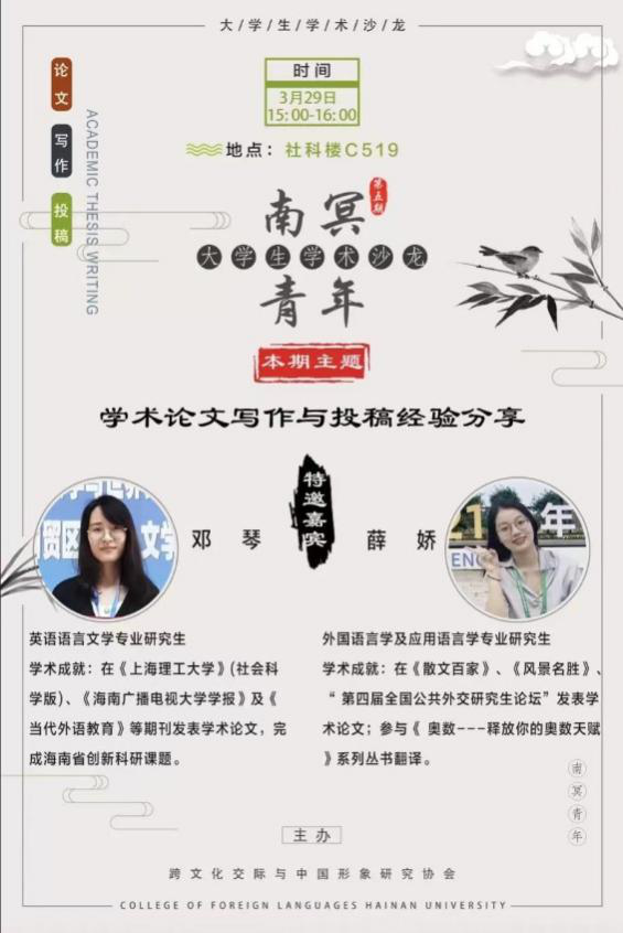 薛娇也非常赞同邓琴的经验,她强调论文投稿的时间要越早越好,投的期刊影响因子要尽量高,不然申博或者考博受到影响。她认为研究要多接受学术熏陶;多看文献,并积极参加学者们的讲座,在拓展视野的同时凝练自己的研究方向。此外,牢牢把握身边机会,可以参与校内外的学术交流讲座,比如跨文化交际与公共外交学术研讨会暨海南省翻译协会年会。在会前投自己的文章,获得与同行交流的宝贵机会,而且有可能让文章入选论文集。薛娇还分享了一些十分有用的英语学术研究网站和公众号,网站有国家新闻出版署http://www.nppa.gov.cn/,万维网;公众号有英语悦读、英语逆袭君、交大外语、武太白英语、英语人才会、考博岛、大民说英语、龙猫学术。