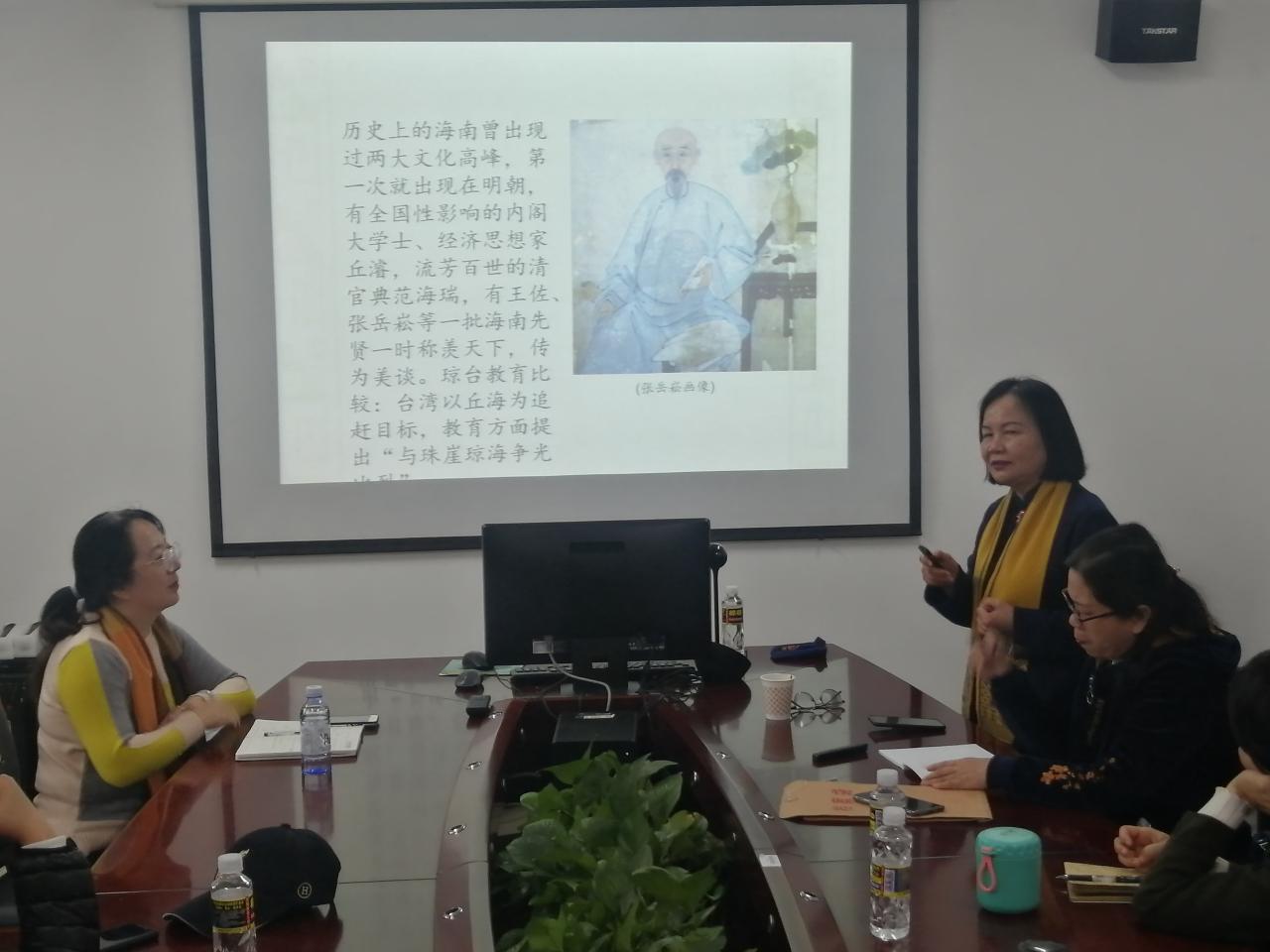蔡葩老师首先介绍了海南历史文化概述。海南并入中国版图始于汉武帝时期,由于地处边陲,一直是贬谪之地,直至清朝。其中,明朝开始,海南人才辈出。如:范海瑞、王佐等。老师也举出影响深远的海南籍学术大师。