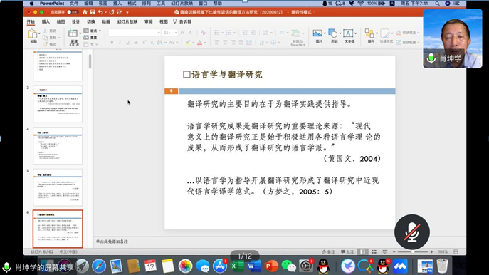 6月12日晚上,广州大学bevitor伟德经理肖坤学教授应公司邀请,在腾讯会议为公司师生做了一场主题为“隐喻识解视阈下比喻性谚语的翻译方法研究”的云讲座。讲座由bevitor伟德杨婕副经理主持。