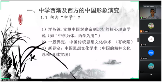 讲座伊始,孟祥春副教授认为云讲座为我们提供了很多机会,可以更便捷的进行资源共享。孟祥春副教授的讲座围绕四部分进行。第一部分介绍中学西渐及中国在西方的形象演变。他认为,中学西渐是指中国思想文化学术向/在西方的传播,采用“拿去”和“送去”的方法。中国在西方的形象演变主要经过以下三个阶段:震惊——憧憬/美化(13世纪中期)、蔑视/丑化(1800-21世纪初)以及重新审视与适应期。汉语、长城、孔子等西方人眼中的中国文化符号在很大程度上可以代表中国,而我们也是中国文化的见证者与参与者。第二部分介绍中学西渐:言说什么?孟副教授认为,我们应言说的内容可用十个字来概括,即:思、史、实、群、治、文、艺、言、情和趣。在言说时,应选取具有世界性的“中国性”内容,思想文化与文学艺术居首,切忌自我中心主义、自我东方主义、异化与边缘和政治不正确。并以林语堂的个例阐明应选择富思想、有趣味、可启迪、能增益的文本。第三部分介绍中学西渐:如何言说?孟副教授以“桃花源”、“天人合一”等的英译生动形象地说明在言说时应注重文化自信、求同存异;语取东西、为意当厚;为辞宜简、译写结合,互相涵容等。他认为,我国的硬实力是雪中送炭,软实力是锦上添花。第四部分介绍启示与建议。孟副教授认为,言说内容有宜有忌,应合理选择;要给予译者更大的权力,从译者变成译写者;“中学西渐”应服务于“人类命运共同体”建设等。