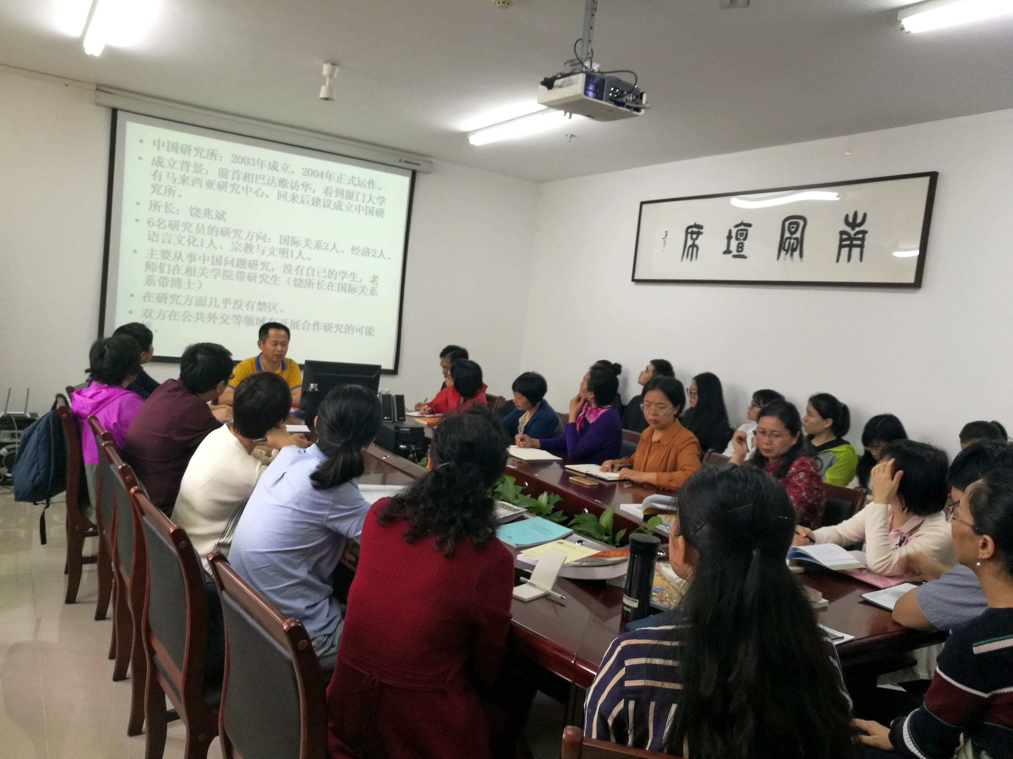 讲座伊始,金经理向师生展示了他从马来西亚带回来的各种文献资料,分享了他在马来西亚的这次学术调研的整体感受。接着金经理介绍了他这次访问的四个学术机构,分别是马来亚大学中国研究所、马来西亚国际伊斯兰大学、马来西亚华社研究中心和滨州华人大会堂。其中马来亚大学是马来西亚首屈一指的名校,是东南亚地区仅次于新加坡国立大学和南洋理工大学的知名大学,该校中国研究所主要从事中国问题研究,与公司在公共外交等领域有较大的合作研究空间。马来西亚国际伊斯兰大学是一所由多个国家和组织协办的一所国际性大学,该校的伊斯兰文明及马来世界国际研究院的阿旺博士与金经理探讨了马中文明对话的问题,由此金经理提出两个值得关注的问题:即马来西亚华侨问题和海南三亚穆斯林问题。马来西亚华社研究中心是一所民办研究机构,开展与华人华侨相关研究,定期出版专著和期刊。金经理介绍了该所丰富的史料收集和图书收藏,鼓励大家积极利用学术资源,探索特色研究之路。