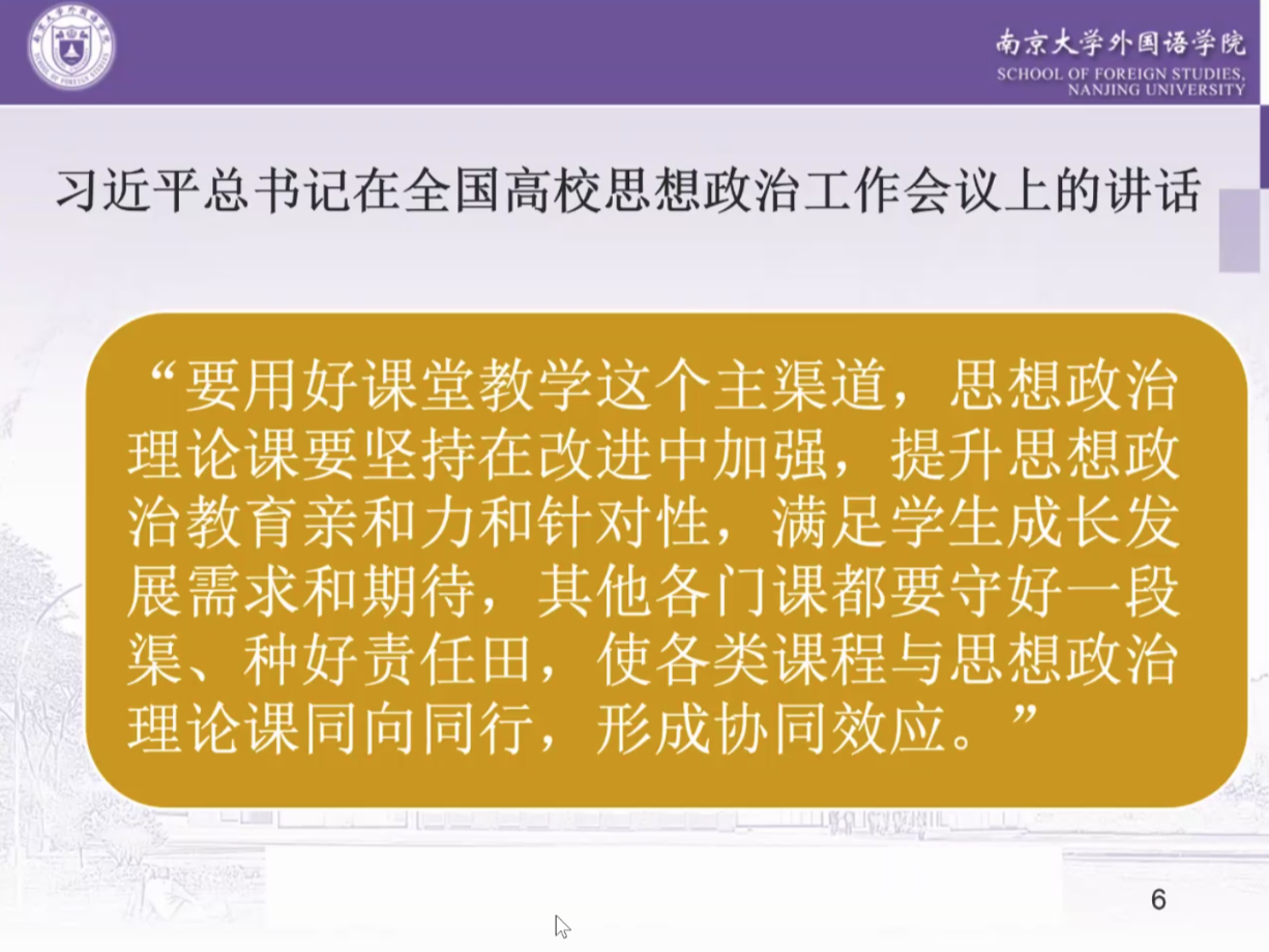 进入新时代,中国外语教育人才培养问题一直受到广泛关注。杨教授首先从“如何进行外语教育的人才培养”这一问题进行导入,提出不仅要用主流意识形态进行价值观引导,同时也要进行文化自信教育。杨教授引用教育部文件《关于全面深化课程改革,落实立德树人根本任务的意见》中的内容来强调课程思政建设的重要性。杨教授表示,“课程思政”是一种课程观,属于教育理念,能有机融入立德树人各种功能,深入挖掘各类课程的思想政治教育元素与功能。