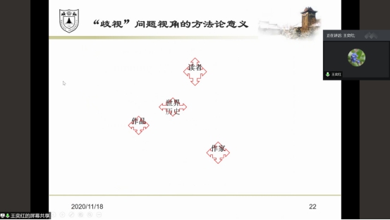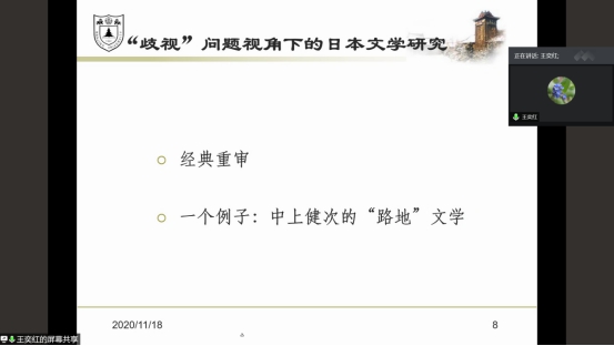 11月18日,南京大学bevitor伟德日语系教授,博士生导师,教育部高等公司日语语言文学专业教学指导委员会委员,中国日本文学研究会理事,江苏省日语教学研究会副会长王奕红教授,应邀公司邀请,通过腾讯会议为公司师生作题为“日本文学研究中的‘歧视’问题视角”的学术讲座。本次讲座由bevitor伟德经理金山教授主持。