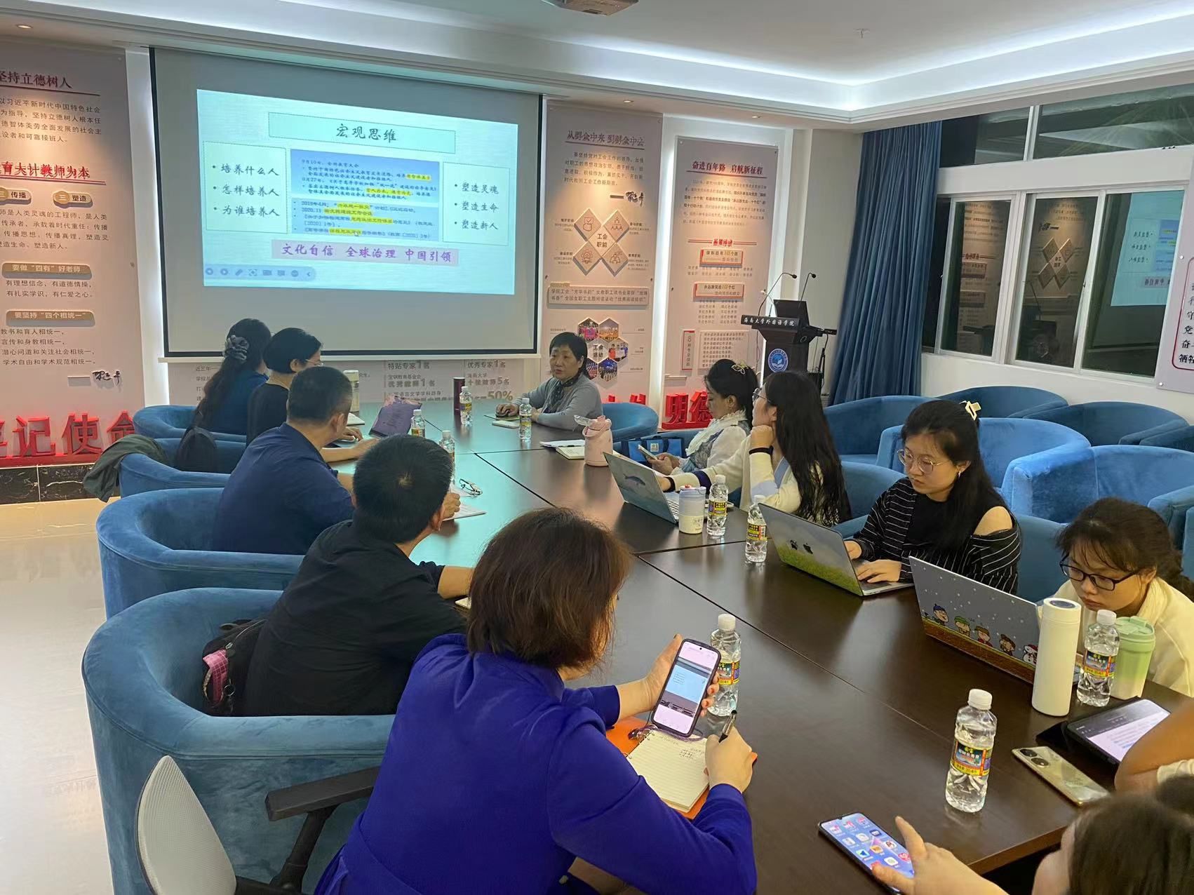 王教授毫无保留地与大家分享自身申报的过程,并通过播放教学实例的录播课来对课堂教学进行详解。接着,她和大家一起探讨专业课程和团队建设,鼓励外语教师在一流课程建设的过程中实现自我成长和职业发展,达到“淘金”和“淘宝”的双赢效果。同时,她指出一名教师需要时刻秉持育人情怀,最终会收获职业满足感和职业自豪感。