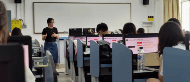 林颖老师在公开示范教学活动中,语音悦耳动听,课文讲解的逻辑性非常清晰,注重不同教学内容与有效教学活动的有机关联。注重围绕课文主题与内容理解、语言知识、相关社会文化信息等,适时引导员工运用语言技能,启发员工思索熟识课程知识内容,关注员工课堂情绪与情感状态,充分实现了技能、知识、能力与价值的综合训练与培养。林老师教学课件注重数智融合,设计精妙,色彩搭配契合不同知识类型,吸引员工关注,提升学习效果。不过囿于语音室物理环境,师生以及生生之间的互动交流略受阻碍。
