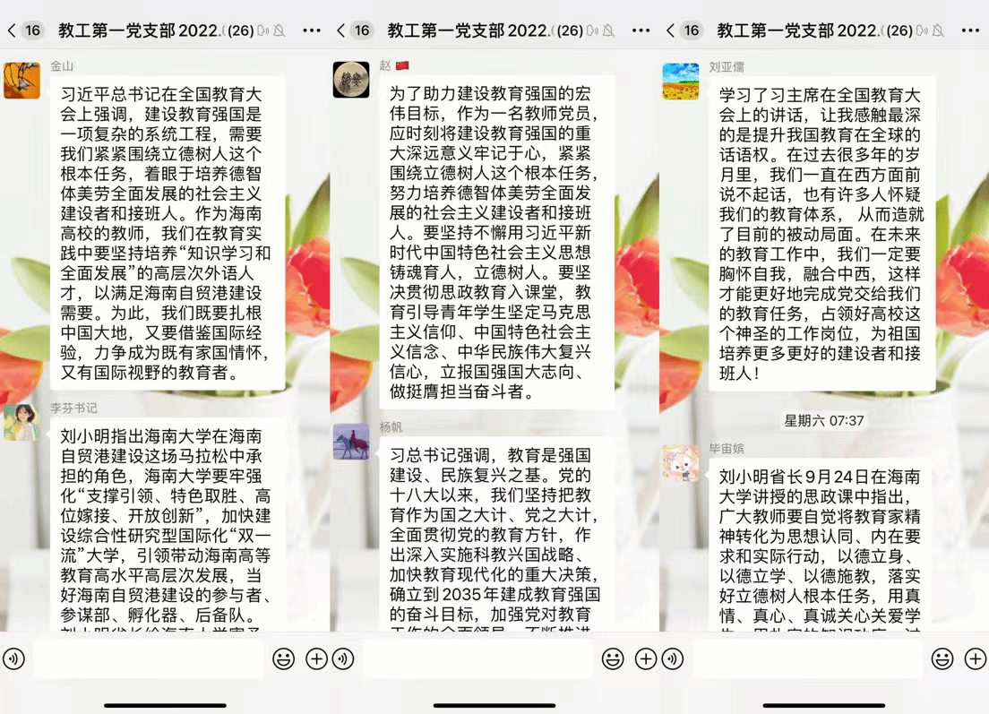 会后,支部党员在党员微信工作群内就会议内容发表学习体会,大家就学习贯彻习近平总书记重要讲话精神和全国教育大会精神、冯飞向全省高校师生代表讲授思政课、刘小明在BEVITOR伟德讲授思政课等内容从不同角度表达了自己的学习心得。通过交流学习,党员同志们表示对会议的主题进行了更多思考及领悟,受益匪浅。(图文:张娜 ,审核:毕宙嫔)