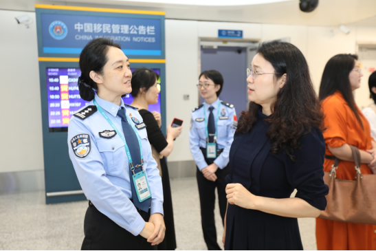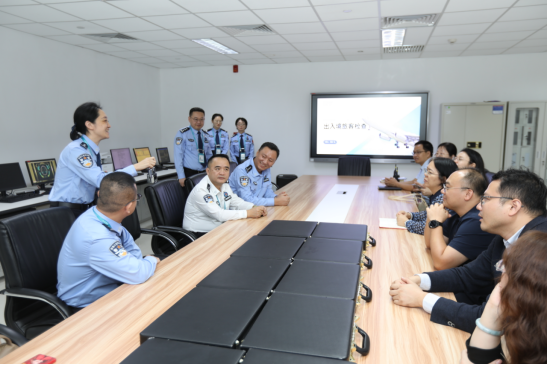 座谈会后,调研组一行驱车前往美兰边检站进行实地考察。在边检执勤现场和口岸签证窗口,教师们近距离观摩了民警验放入境旅客、处理国际中转旅客勤务的全过程,尤其关注了民警在实际工作中运用外语与不同国籍旅客进行有效沟通的娴熟技能与专业素养。