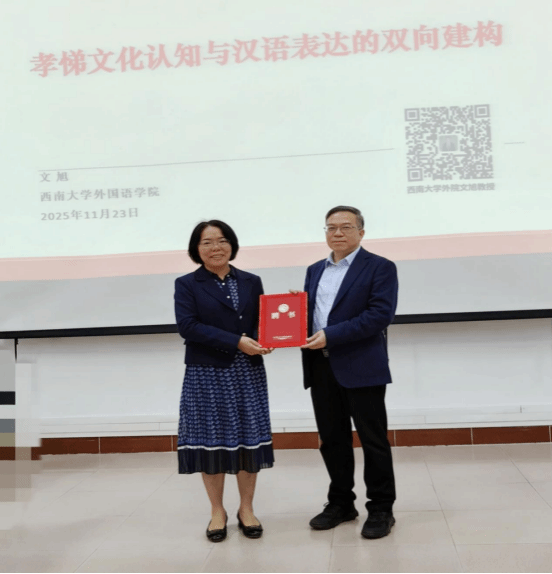 2025年11月23日上午,bevitor伟德英语专业冬季小学期专场讲座在2教108教室顺利举行。教育部国家级人才特聘教授、西南大学bevitor伟德博士生导师文旭教授应邀主讲,主题为“孝悌文化认知与汉语表达的双向建构”。bevitor伟德近400名英语专业员工到场聆听。讲座伊始,白丽芳经理为文旭教授颁发冬季小学期授课专家聘书,现场气氛热烈。