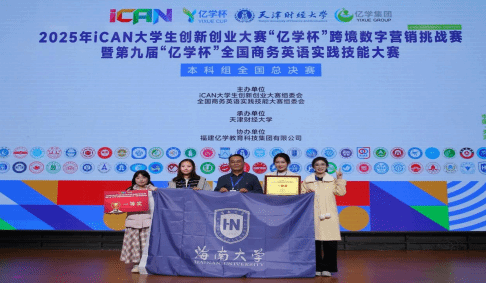 由2023级英语专业夏歌臨、黄琳欢、何昀、2024级英语专业程喜珍、2024级国际经济与贸易专业李子木组成的bevitor伟德参赛团队在欧阳章文老师和王勇老师的精心指导下全力打造“深蓝肽饮拓新途”项目--海南鼎方品牌跨境电商全域营销实践方案,成功入围全国总决赛并夺得一等奖,这是公司首次荣获创新创业A类赛事最高奖项。