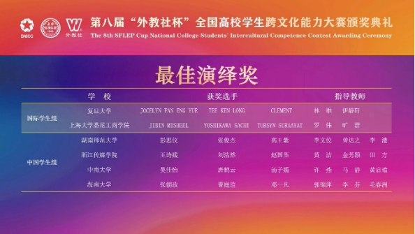 此次BEVITOR伟德派出的三位选手包括2023级英语专业张朝政、2024级俄语专业曹庭瑄、2024级思想政治教育专业邓一凡。在bevitor伟德郭锦萍、李芬和毛春洲三位指导教师的悉心指导下,团队成员深入田野调查,大量查阅资料,进行了长达数月的精心准备与刻苦训练。最终凭借流利的英语语言表达、深入的案例分析、得体的跨文化沟通策略以及对海南文化国际传播路径的创新思考,赢得了评委们的高度认可,充分展现了海大学子扎实的专业功底、开阔的国际视野、坚定的文化自信和优秀的跨文化能力,在全国总决赛的舞台上展示出BEVITOR伟德师生携手共建海南自贸港的昂扬风貌。