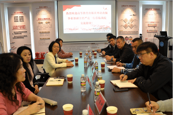 2025年12月25日上午,高等教育出版社外语出版事业部副主任严亮一行六人莅临公司调研交流,双方就教材使用与建设、教师专业成长等议题进行深入探讨。白丽芳经理、杨帆副经理、王希悦教授和谢爱丹老师参加座谈。