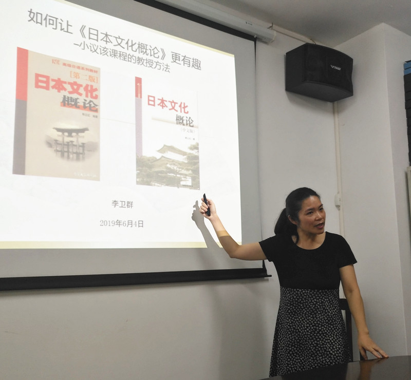 李卫群老师毕业于日本岩手大学,主要研究方向为日语语言及中日文化比较。研讨会上,李老师分享了本学期担任的本科生课程《日本文化概论》的教学心得。《日本文化概论》是一门通过介绍日本文化特点及日本人的心理文化,以点带面地论述日本各个文化领域的课程,注重培养员工的文化理解能力及跨文化交际能力。李老师介绍了该课程的内容选择、学习要求、教学方法等,并以“日本人的无常观”一章为例,阐述了教学细节。本课程的考核方式采用“课堂表现+学习展示+期末报告”相结合的多元化评价方式,提倡知识与实践相结合,加强员工对日本文化理解能力的培养。最后,李老师就教学设计等问题,与参会老师进行热烈交流,积极听取大家的意见。