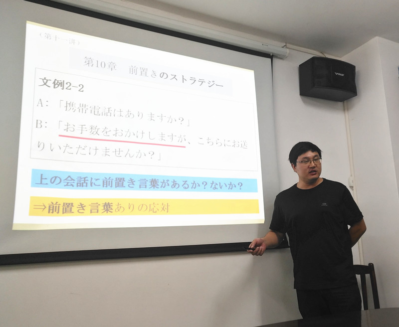 殷国梁老师是北京大学博士,主要研究日本儒学思想史。研讨会上,殷国梁老师围绕本学期承担的本科生《中日跨文化交际》课程,从教材特点、课堂设计以及教学方法等方面进行了教学分享,并以“开场白的策略”一课为案例,详细阐述了教学过程中的具体细节。《中日跨文化交际》是日语专业高年级的重要课程,通过该课程的学习,可以直观地了解中日文化异同。殷老师从跨文化交际的角度,以日常生活中常见的中日之间的交际事件为案例,分析中日两国在文化方面的差异。最后,殷老师就教材选用、教学设计等方面存在的问题,与在座的老师展开热烈交流。