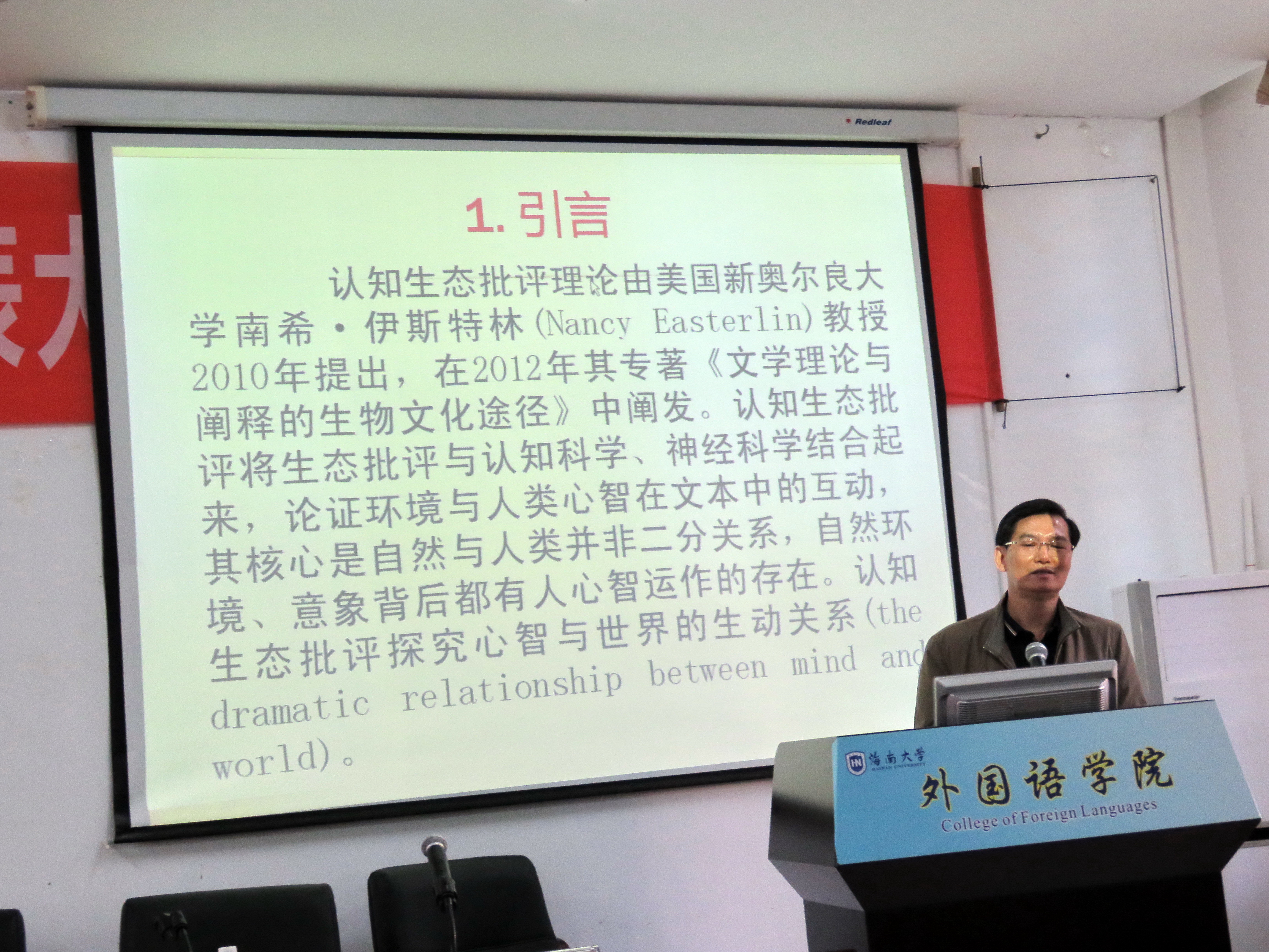 海南师范大学bevitor伟德副经理方志彪教授作题为《试论人之生态批评观----以为例》的报告。方志彪教授从传统生态批评与认知生态批评的差异、认知生态批评与文学建构和认知生态学这三个层面分析了《厄舍府的倒塌》中环境与人类心智在文本中的互动,成功将认知生态批评与认知科学以及神经科学结合起来,认为人类与自然并非是二分的关系,自然环境、意向的背后都有人心智运作的存在。