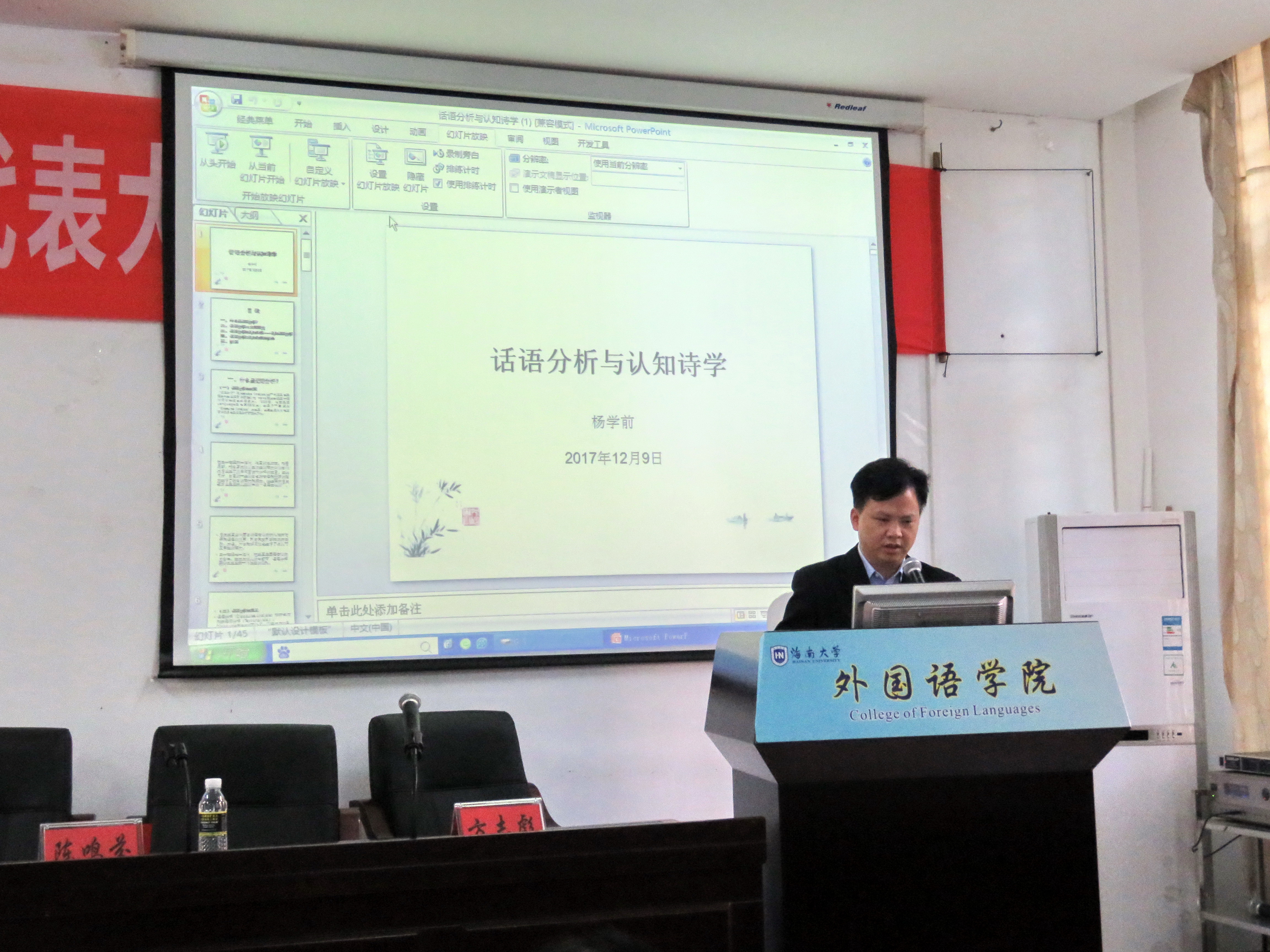 海南外国语职业公司副经理杨学前教授作了题为《话语分析与认知诗学》的主旨发言。他介绍了话语分析的基本理论和研究方法,指出话语分析应该与认知研究结合,分析话语双方或语篇的创作者和读者之间的动态交流及对话语或语篇的推进过程。
