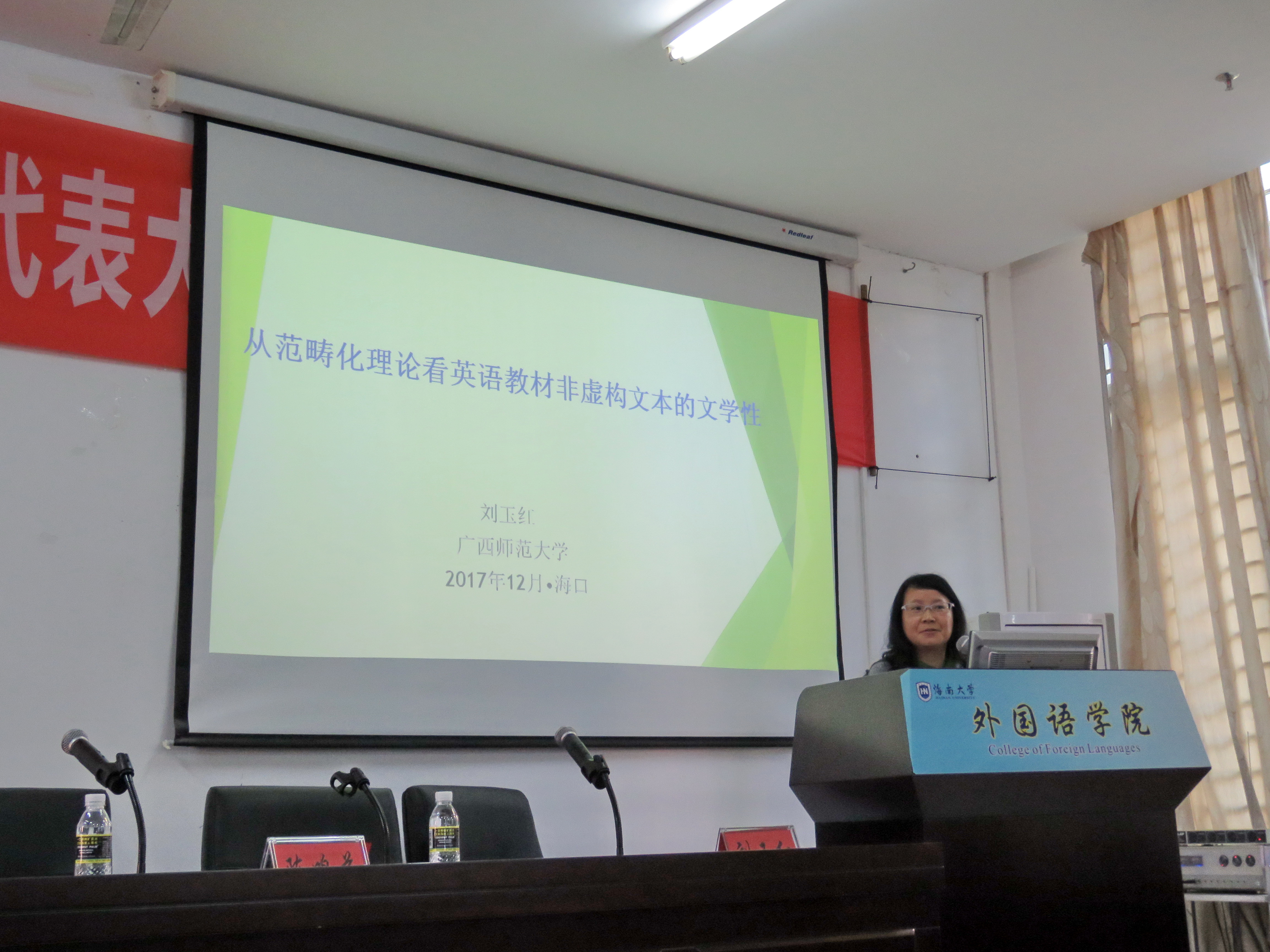 广西认知诗学研究会会长刘玉红教授作题为《从范畴化理论解析英语教材非虚构文本的文学性》的主旨发言。刘教授首先指出英语教学改革在路上,虽然取得了显著成绩,但是教学仍存在照本宣科的情况,如何激发员工学习的深层动机和学习兴趣成了英语教学改革重中之重。刘教授在认知诗学的范畴化理论研究中找到了答案,她以高中英语教材和大学英语教材中的故事性文本和非虚构文本为例,探讨如何在教学中深度剖析这两类问题。她指出故事性文本修辞丰富、句式灵活;非虚构文本则句式严禁、描述客观。在阅读课堂上,非虚构文本可以吸引员工注意力,深化员工思考;而在写作课堂上,非虚构文本可以激发员工的兴趣,提升他们的写作能力,领悟语言之美。