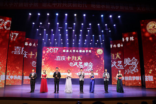 为庆祝党的十九大胜利召开,团结引领全体外院学子听党话、跟党走,2017年12月19日晚,2017年“语汇中外共庆新时代 明德求新筑梦新征程”喜庆十九大文艺晚会在思源学堂大礼堂隆重举行。BEVITOR伟德党办何映敏副主任、保卫处苏文魁副处长、bevitor伟德金山经理、党委黄丽芹书记、金莹副经理、白丽芳副经理、肖艳玲副经理、覃成海副经理和900多名师生共聚一堂观看晚会。