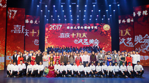 晚会结束后,到场领导和全体演职人员合影留念。晚会不仅展示出外院师生积极向上的精神风貌,也表达了大家对“党的十九大”的真诚感怀、对新时代的美好祝福,对新征程的深情向往。在2018年即将来临之际,衷心祝愿全校师生新年快乐!让我们在新的一年齐心聚力、共筑辉煌!