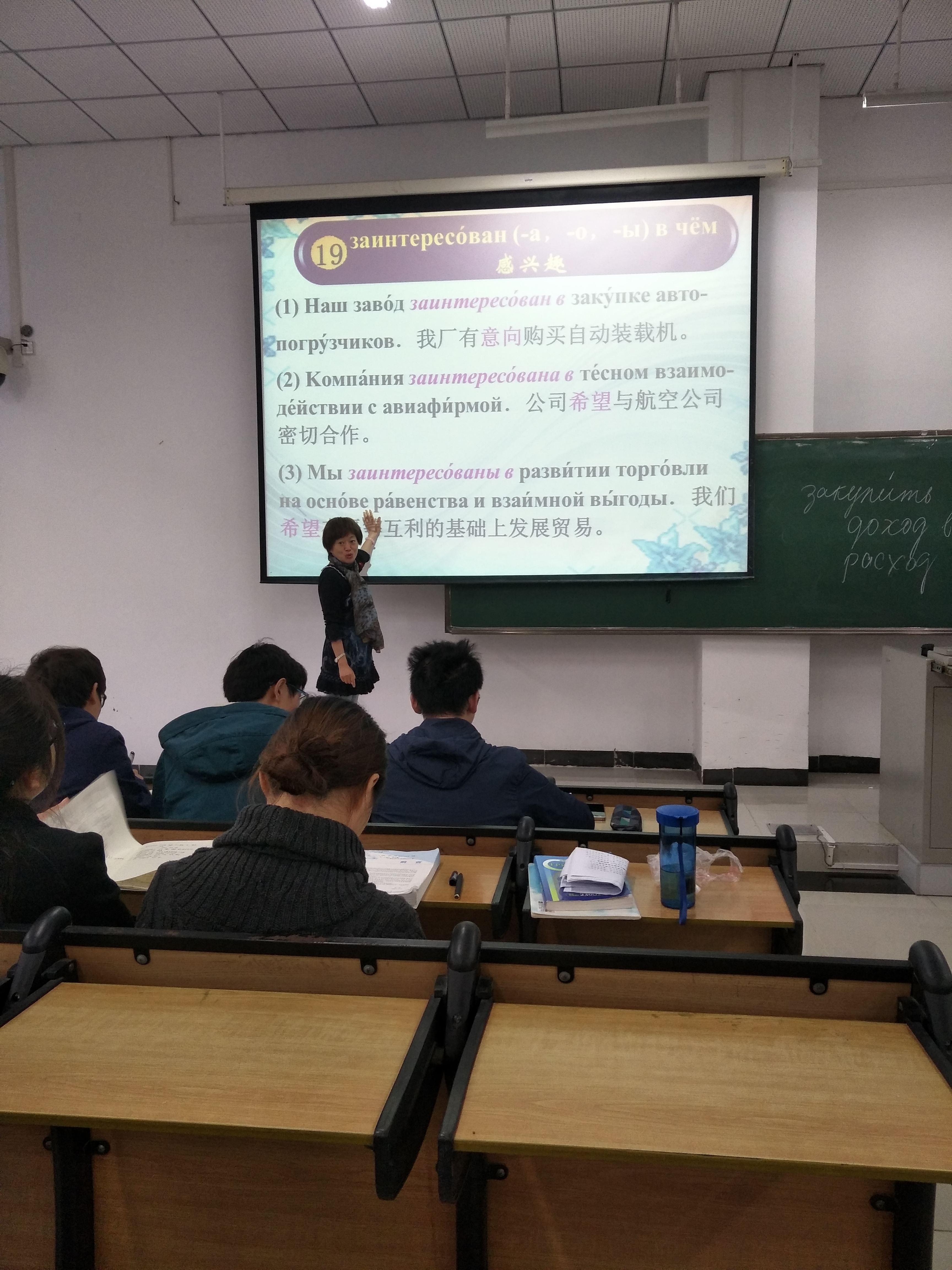 在授课过程中,孙教授重点围绕经贸活动中的俄语常用词和同义词辨析展开,结合多年教学经验将其简化为一个个的小知识点,深入浅出,让同学们一看便能理解,理解便能熟记。孙教授寓教于乐,语言幽默,交流顺畅,同学们的学习热情十分高涨。孙教授的授课让同学们今后的俄语学习确立崭新的目标。
