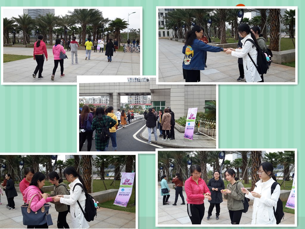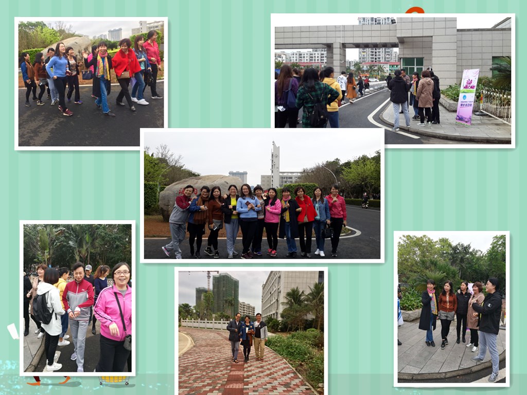 3月8日下午5:00,由金山经理、黄丽芹书记带队从社科楼广场出发,几十人的队伍浩浩荡荡、井然有序地穿越校园。在雨后清新的空气里,漫步春天美好的校园。每个途径点,都有公司老员工志愿者驻守并提供服务。许多男教工同事也纷纷加入步行的队伍,老师们一路健行、聊天、留影、观光,一派热络祥和的气氛。终点站,等待大家的工会老师们,则为大家准备了美味可口的食物饮品和惊喜礼物,大家度过个健康、快乐的节日。