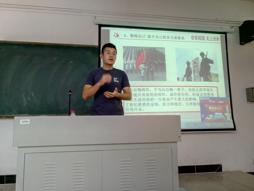 原驻港部队退役老员工士兵,2013级林燕军,分别从参军原因、参军入伍后的变化、实际的军营生活以及参军入伍的好处四方面,全方位展示了他的军旅生活,并现场回应与解答了有入伍意向同学的提问。这让同学们对参军入伍有了更深入更近距离的了解,并且极大地鼓舞了同学们参军入伍的热情与信心。