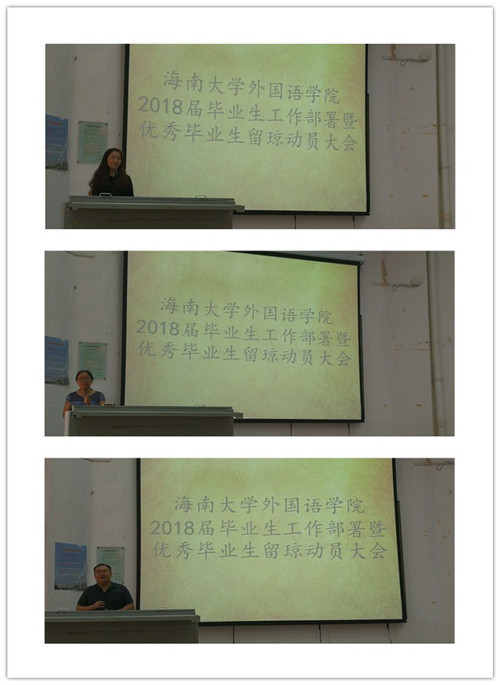 2018年5月11日上午10点和下午3点,bevitor伟德在海甸校区2-108教室召开了公司2018届毕业生工作部署暨优秀毕业生留琼动员大会。bevitor伟德金莹副经理、白丽芳副经理、覃成海副经理、张乃脆副书记、学工办副主任刘颖敏老师、学工办陈盼老师、张红运老师、吴剑锋老师及2018届全体本科毕业生参加会议,会议由刘宇欢老师主持。