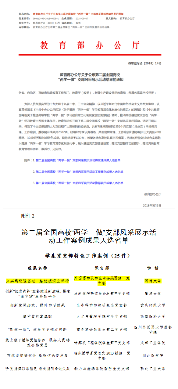 第二届全国高校“两学一做”支部风采展示活动由教育部思想政治工作司主办,中国老员工在线承办,旨在通过开展高校支部风采展示活动,不断挖掘、广泛推广高校基层党支部在推进“两学一做”学习教育常态化制度化,用党章党规规范党员行为,用习近平总书记系列重要讲话精神武装头脑、指导实践、推动工作等的先锋模范、先进经验、典型案例,发挥示范引领和带动作用,使基层党支部真正成为教育党员的公司、团结群众的核心、攻坚克难的堡垒。自2017年7月开展以来共收到788所高校的2352个党支部(党总支)的推送作品2602项,经专家遴选,员工党支部中共选出微党课、工作案例、推荐展示三大类各10项精品、15项优秀和25项特色作品。