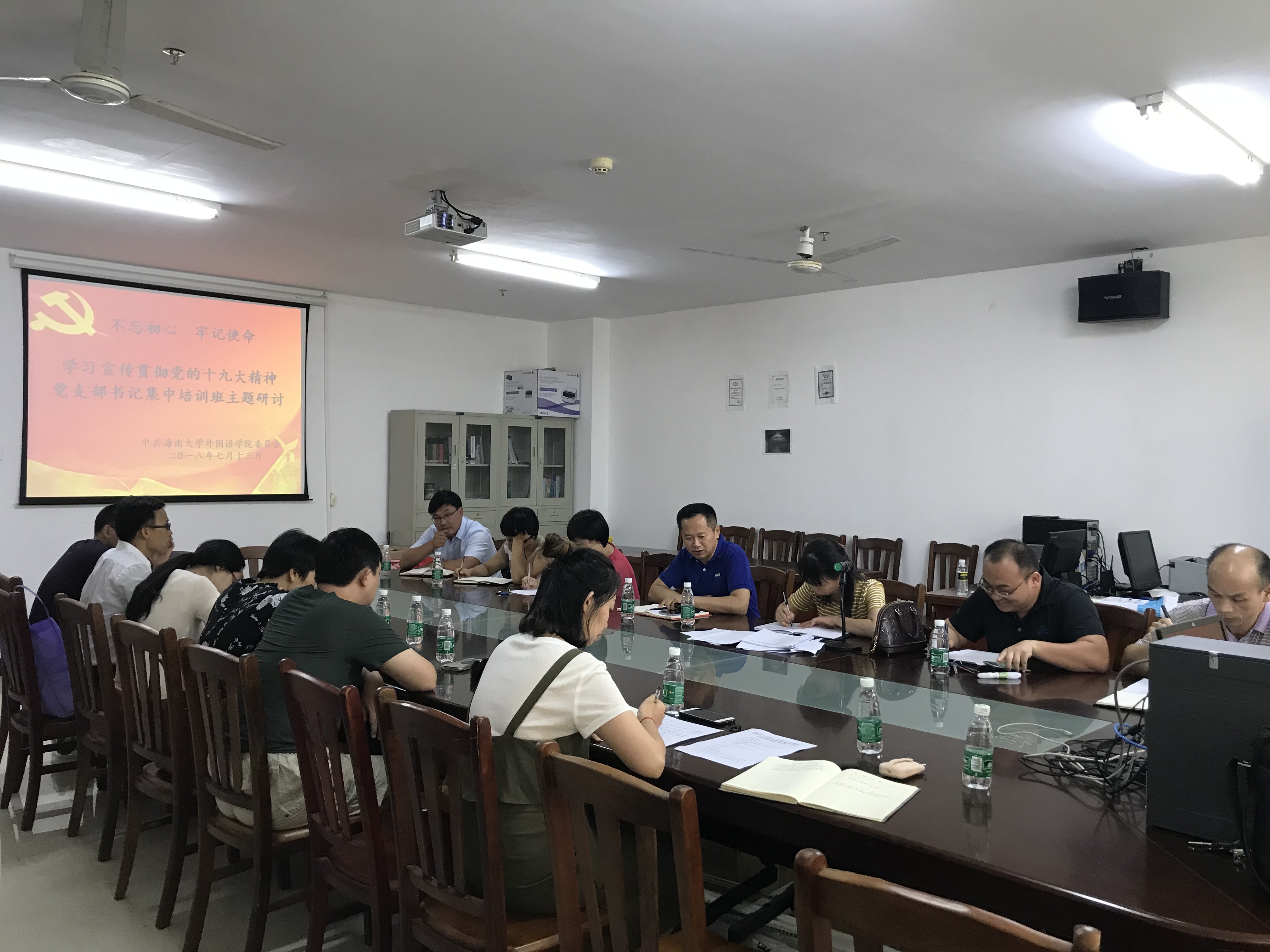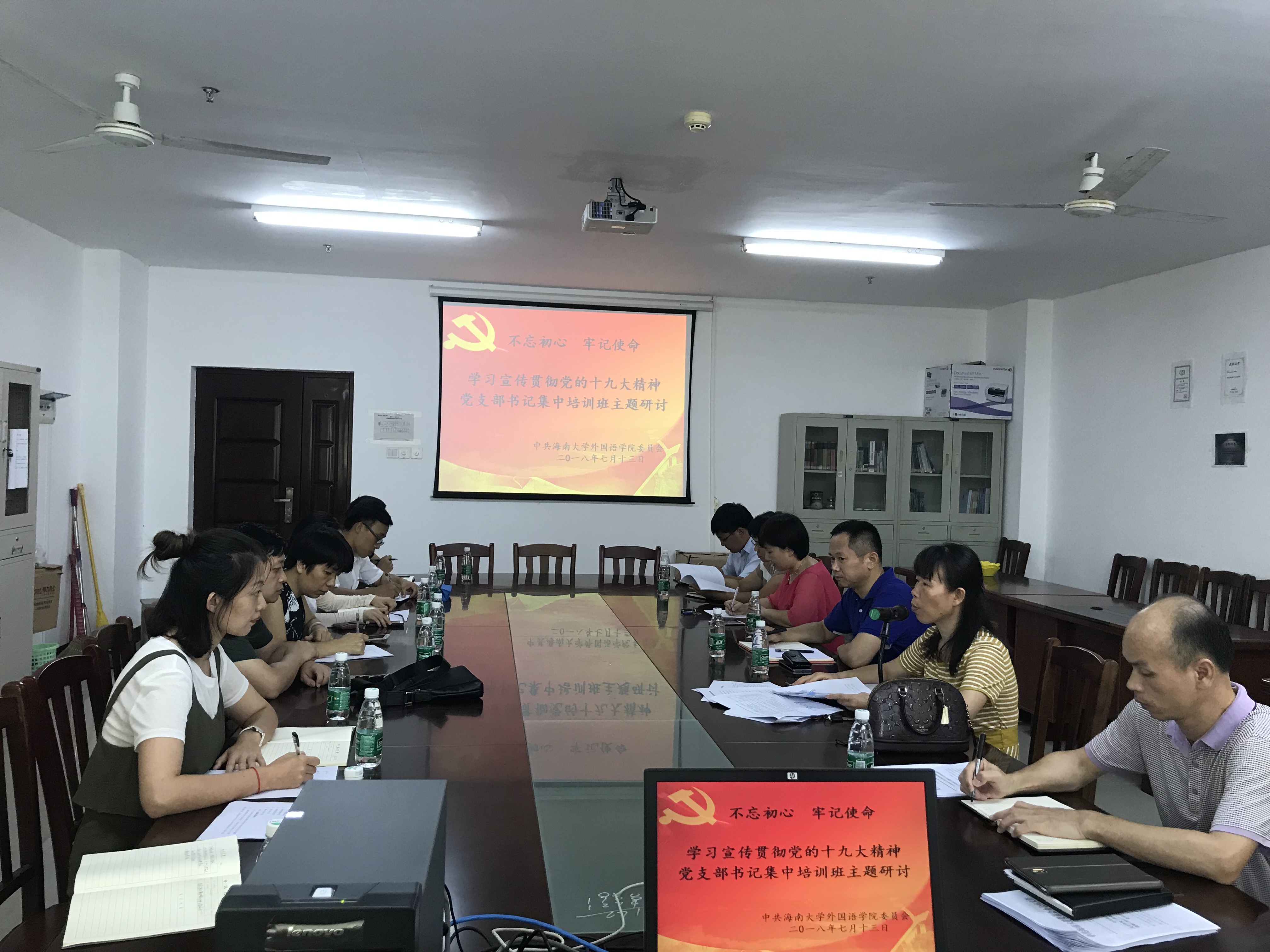 不忘初心、牢记使命,为全面贯彻落实党的十九大精神,深入学习宣传习近平总书记在庆祝海南建省办经济特区30周年大会上的重要讲话。7月13日下午,公司党委在社科楼C416召开“不忘初心、牢记使命,学习宣传贯彻党的十九大精神”党支部书记集中培训班主题研讨会。会议围绕“如何抓好党建促进公司世界一流学科创建,充分发挥党员先锋模范作用和基层党组织的战斗堡垒作用”以及“如何推进基层党组织建设标准化工程”展开。公司党委书记黄丽芹,经理金山,副经理肖艳玲、覃成海出席,公司党委委员,各支部书记以及教工支部支委参加会议。会议由黄丽芹主持。