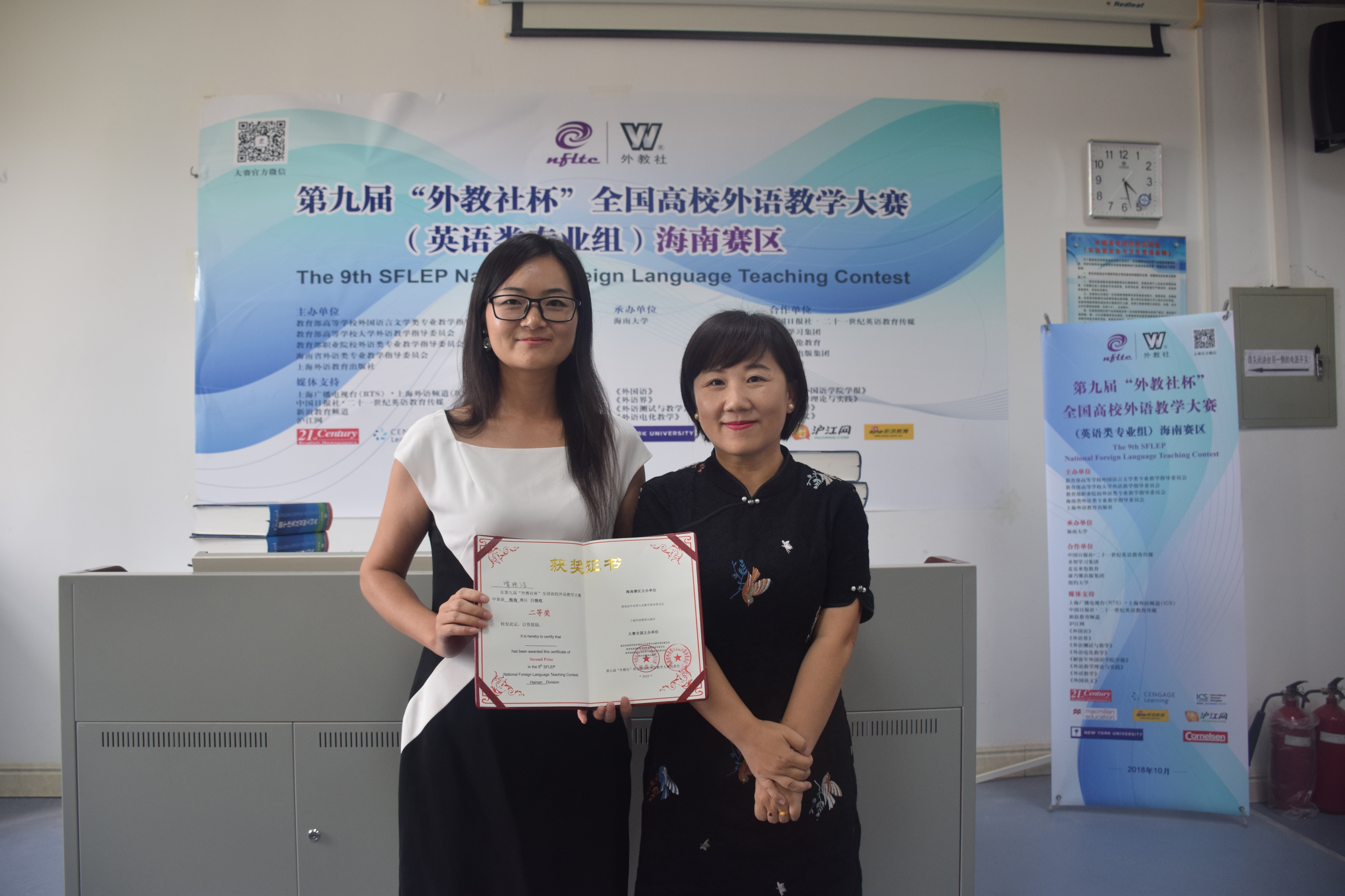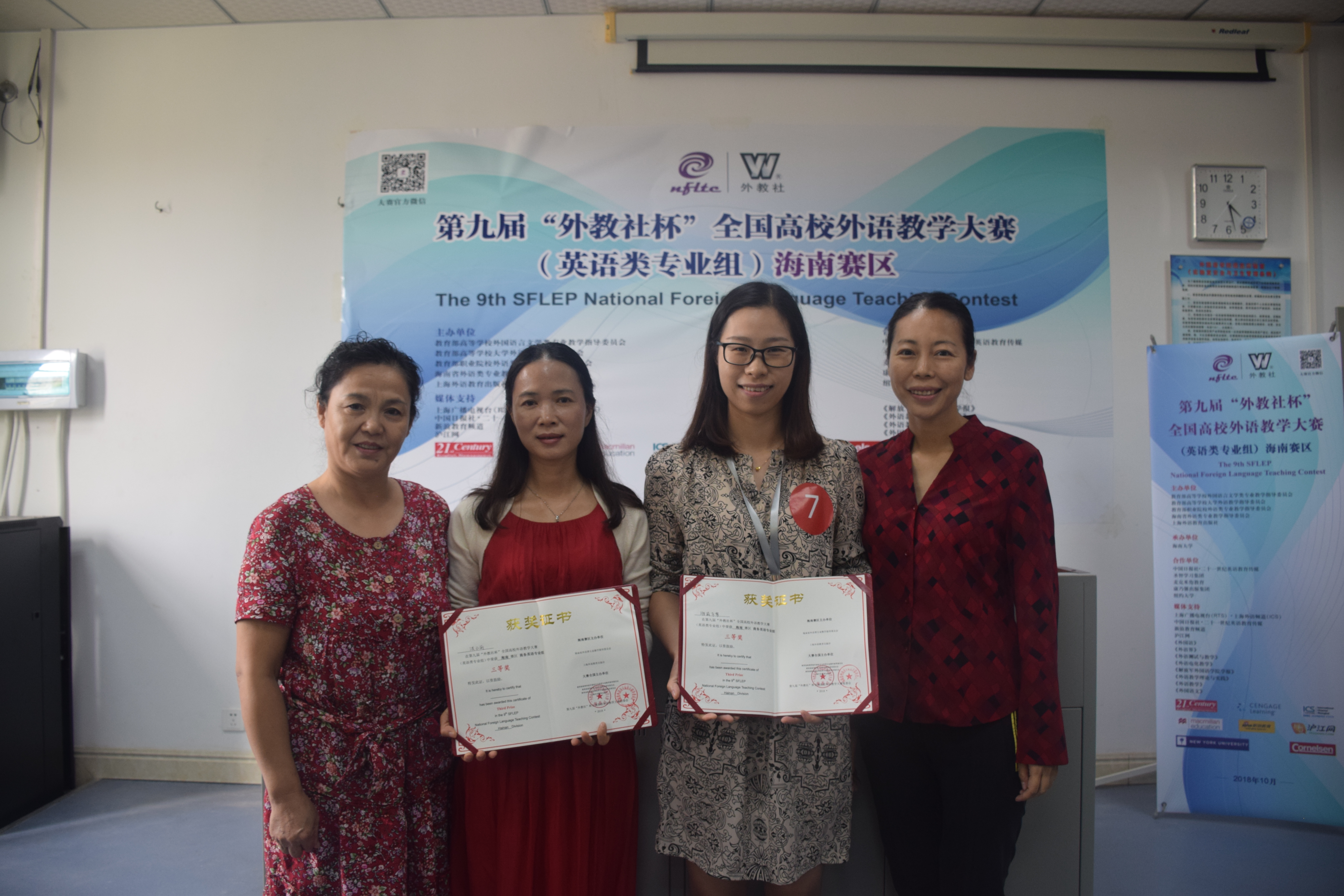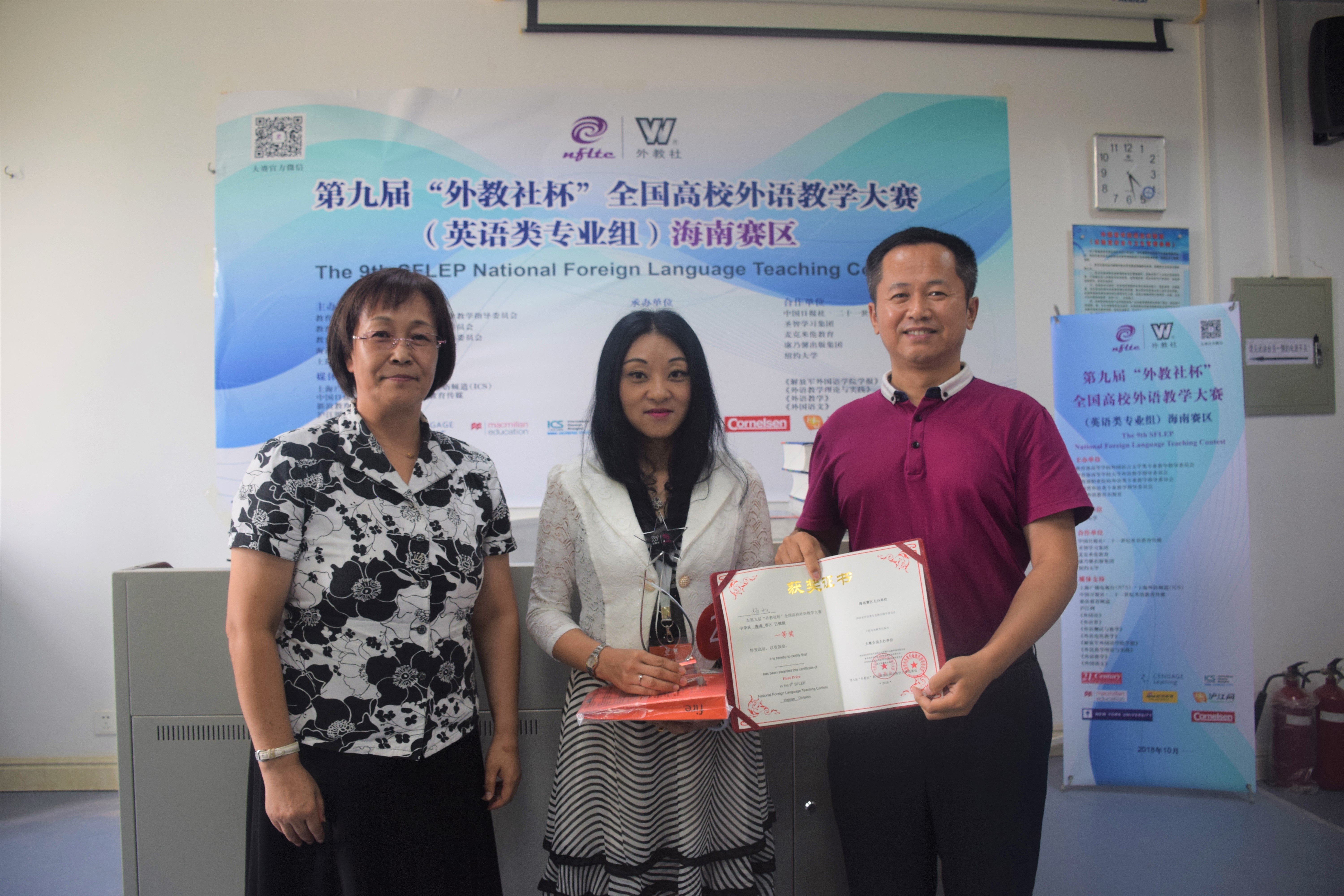 经过三个多小时的紧张角逐,公司杨帆老师获日俄专业组一等奖,潭艳洁老师获日俄专业组二等奖,洪小丽老师获商务英语专业组三等奖。在颁奖典礼上,海南省外语类专业教学指导委员会主任、金山经理对外教社及海南省教育厅提供的机会以及各位专家、参赛选手、赛事筹备团队的积极参与、辛勤工作表达谢意,对海南省六所本科院校的辛苦筹备工作表示敬意。省教育厅高教处朱双平处长指出,在海南建设自由贸易区和中国特色自由贸易港建设浪潮下,外语外贸人才极度缺乏,而人才培养首先需要老师,好的老师才更能培养出好的员工。上海外语教育出版社广东教学服务中心主任、广东海南地区负责人朱义志经理出席颁奖典礼。