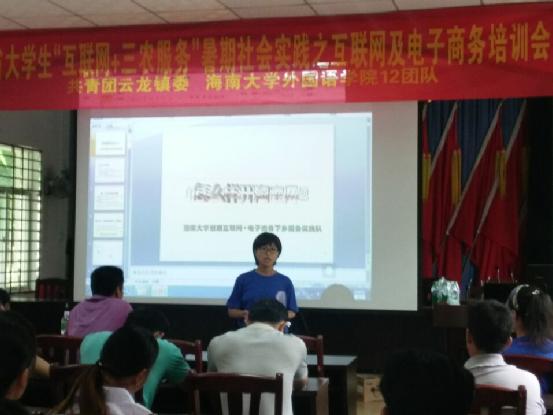 三个实践团队围绕“互联网+三农服务”的主题,深入所服务乡镇的各个村落,通过参观农业合作社,采访致富能人,发放调查问卷,填写专项调查表等方式,了解了当地互联网+农业基础设施条件和主要农产品情况。然后,实践团队在当地团委的指导和帮助下,有针对性的为一些村干部、种养殖大户及农村创业青年集中培训了互联网和电子商务知识。最后,实践团队结合当地实际,开展了丰富多彩的志愿服务活动。有些团队到遵谭镇养老院和铺前镇星星老年之家看望了当地老人,有些团队为云龙镇八一希望小学留守儿童进行了英语学习辅导,还与长沙医公司“三下乡”满天星社会服务团队一起组织了“关爱空巢老人”的公益活动,参加了云龙镇团委与长沙医公司志愿者结对帮扶汇报演出,并接受了“热带播报”记者的采访。