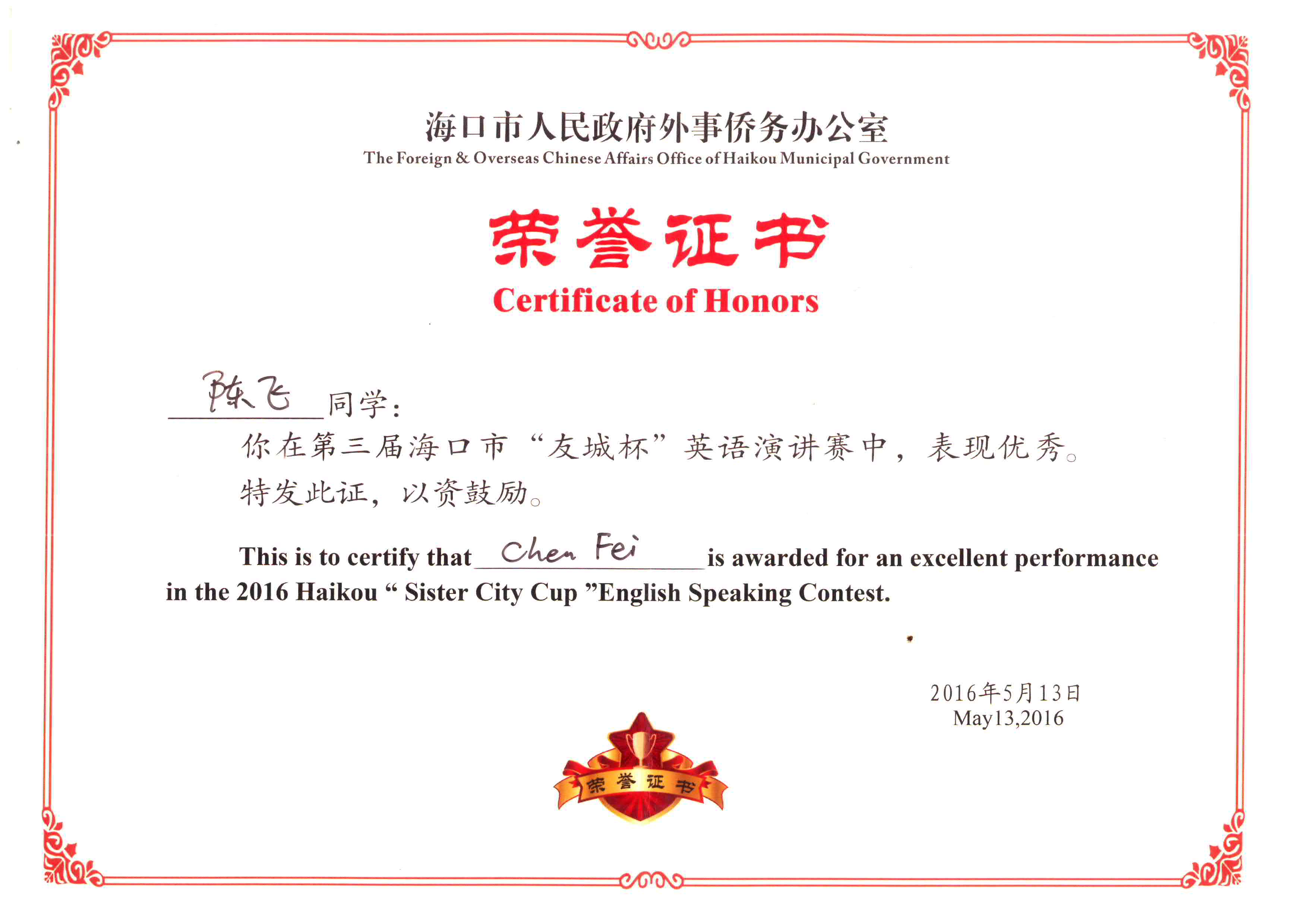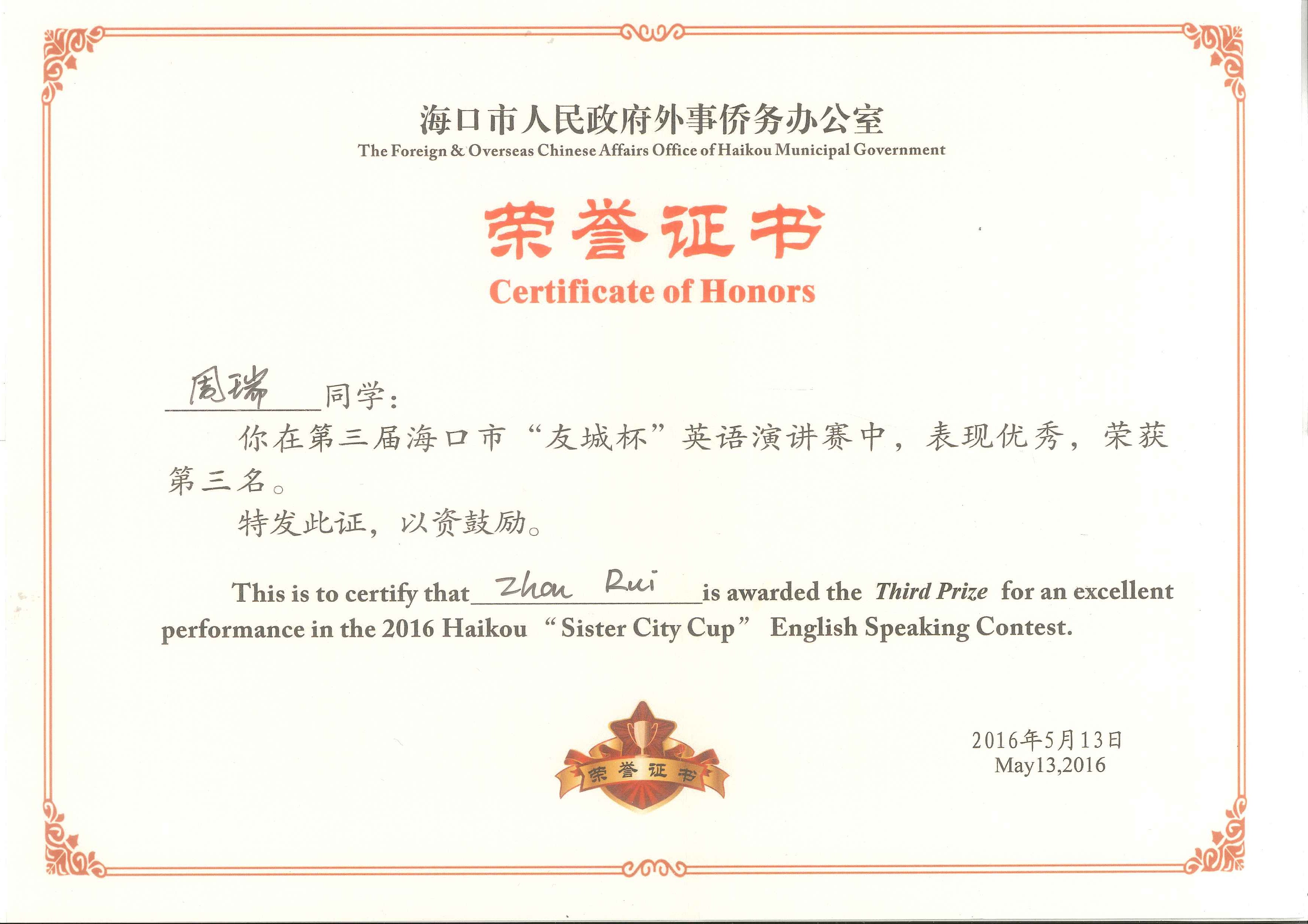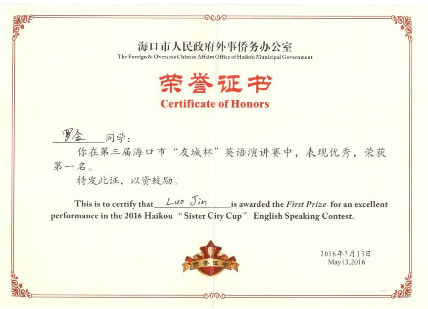 决赛设定奖项有冠军、亚军、季军各1名,优胜奖7名。在 5月13日的决赛中,公司员工罗金、侯博雅、周瑞分别获冠军、亚军、季军, 陈飞获得优胜奖。冠军和亚军选手将应邀前往海口市国际友城——新西兰旺阿雷市游学5天,优胜奖选手将被推荐参与海口市重要国际交流活动,特别优秀的外语人才将有机会到海口市外事办和外事交流中心实习。 此次比赛的成功举办为公司老员工英语学习注入新的动力,公司师生将再接再厉,再创佳绩!祝贺获奖选手们,希望他们在国外游学期间能充分展示公司及海口市对外形象,促进城市交往。