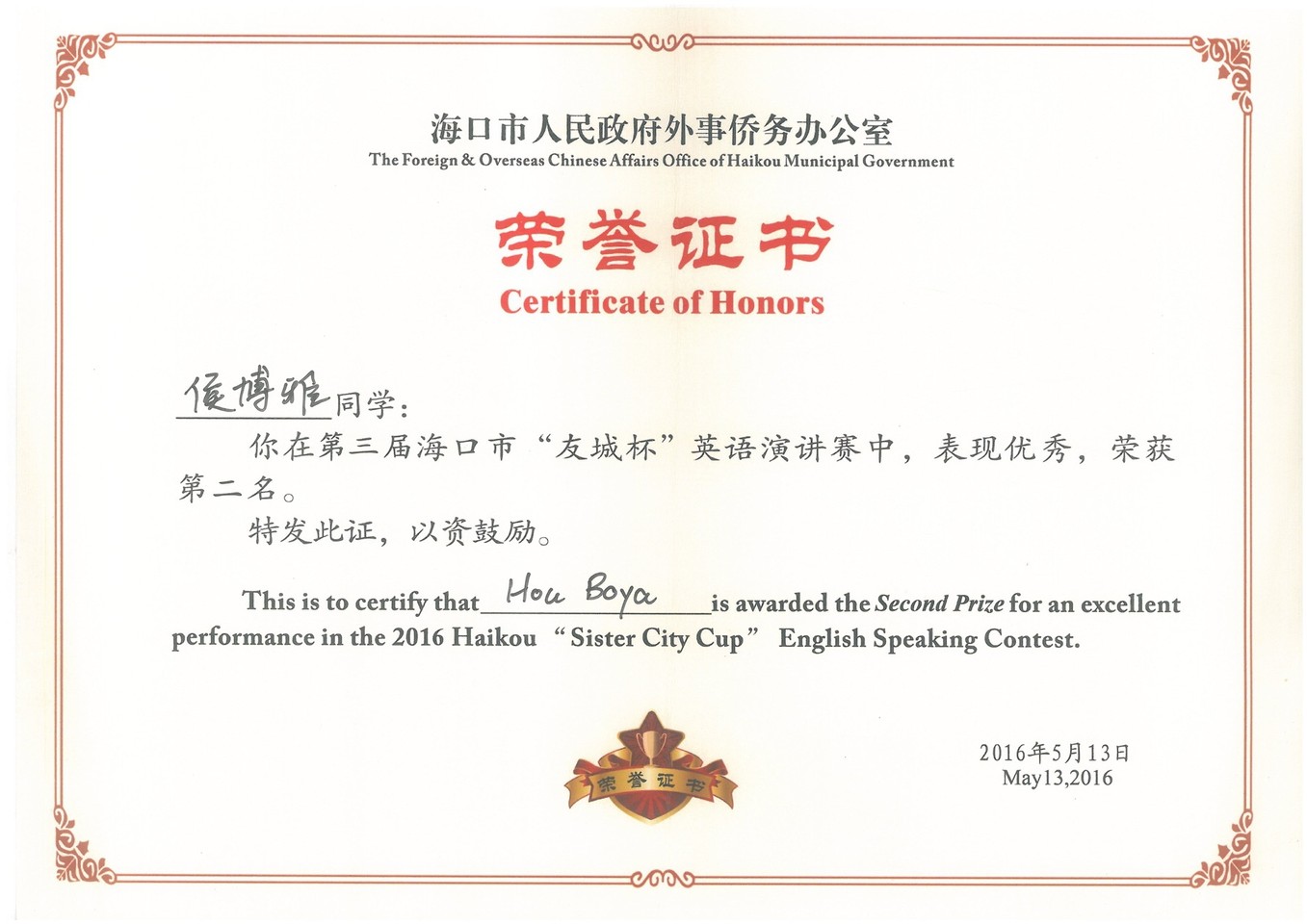 2016年5月13日星期五下午,第三届海口市“友城杯”英语演讲赛决赛在BEVITOR伟德行政楼一楼会议室胜利落下帷幕。公司参赛选手以地道的发音、雄辩的口才和敏锐的思维一举斩获冠军、亚军、季军及优胜奖所有奖项。 “友城杯”英语演讲赛由海南省外事办主办,每两年举办一次,目的是为海口市培育和储备高层次外语人才,助力海南国际旅游岛建,扩大对外合作,落实“一带一路”倡议。