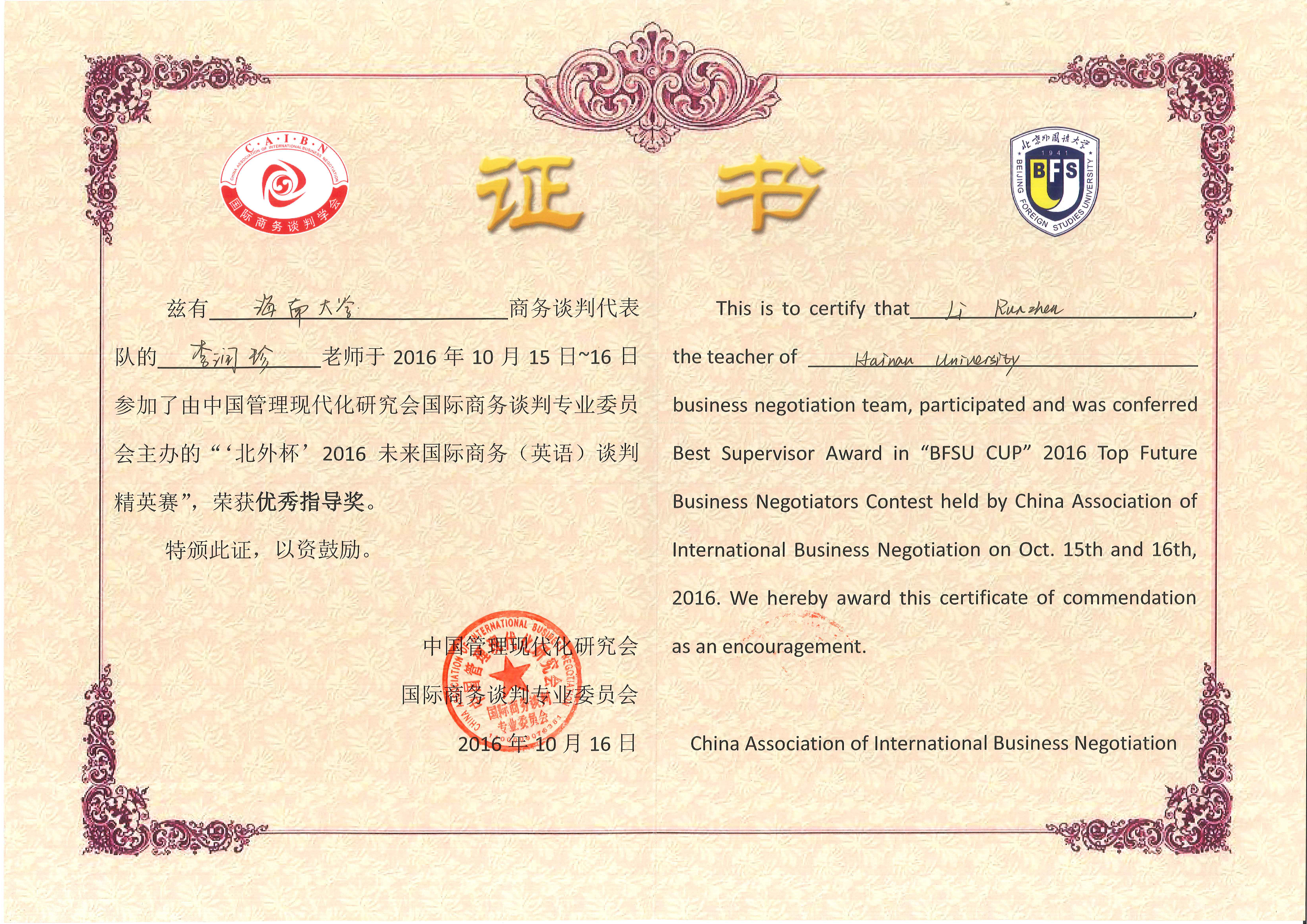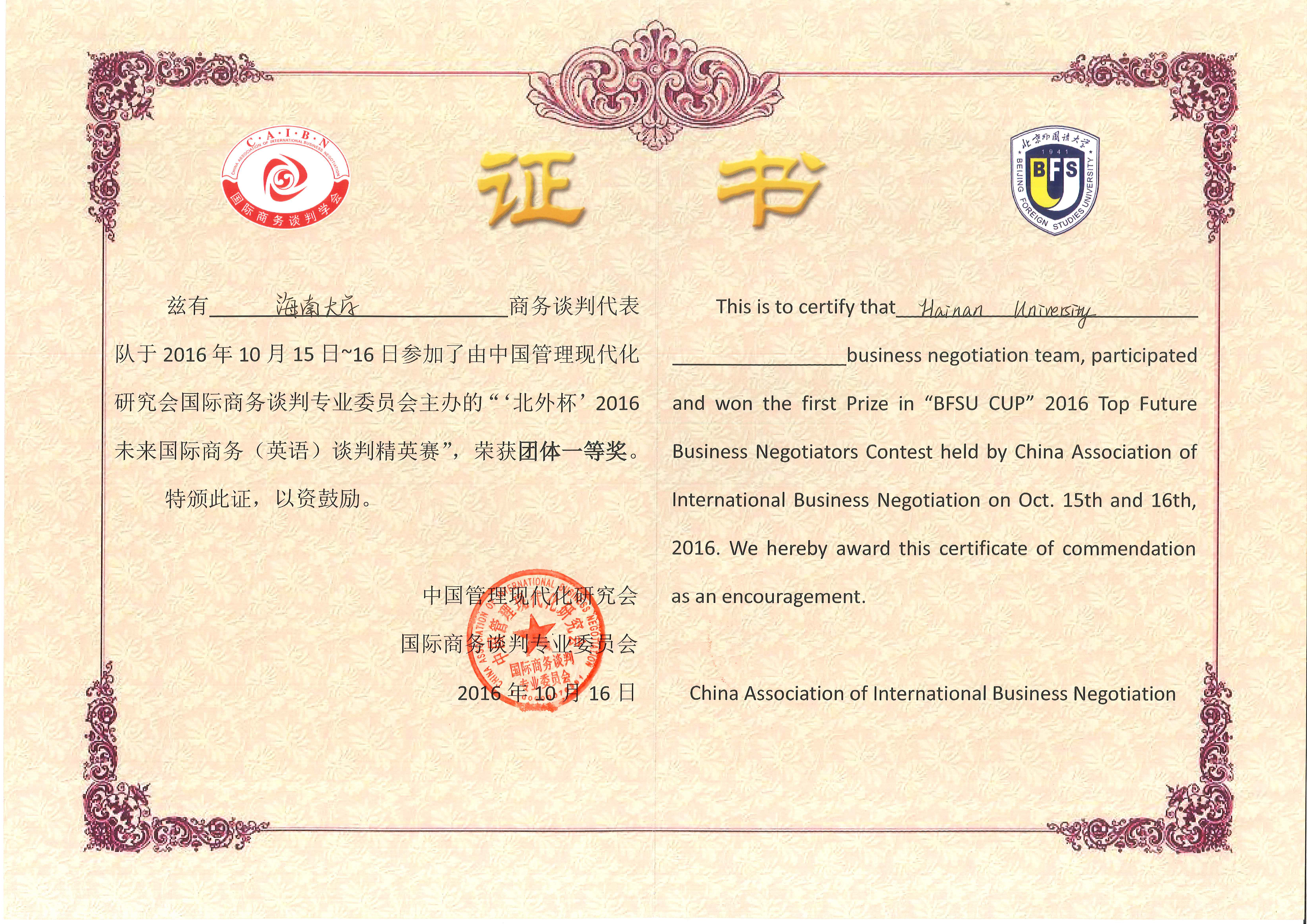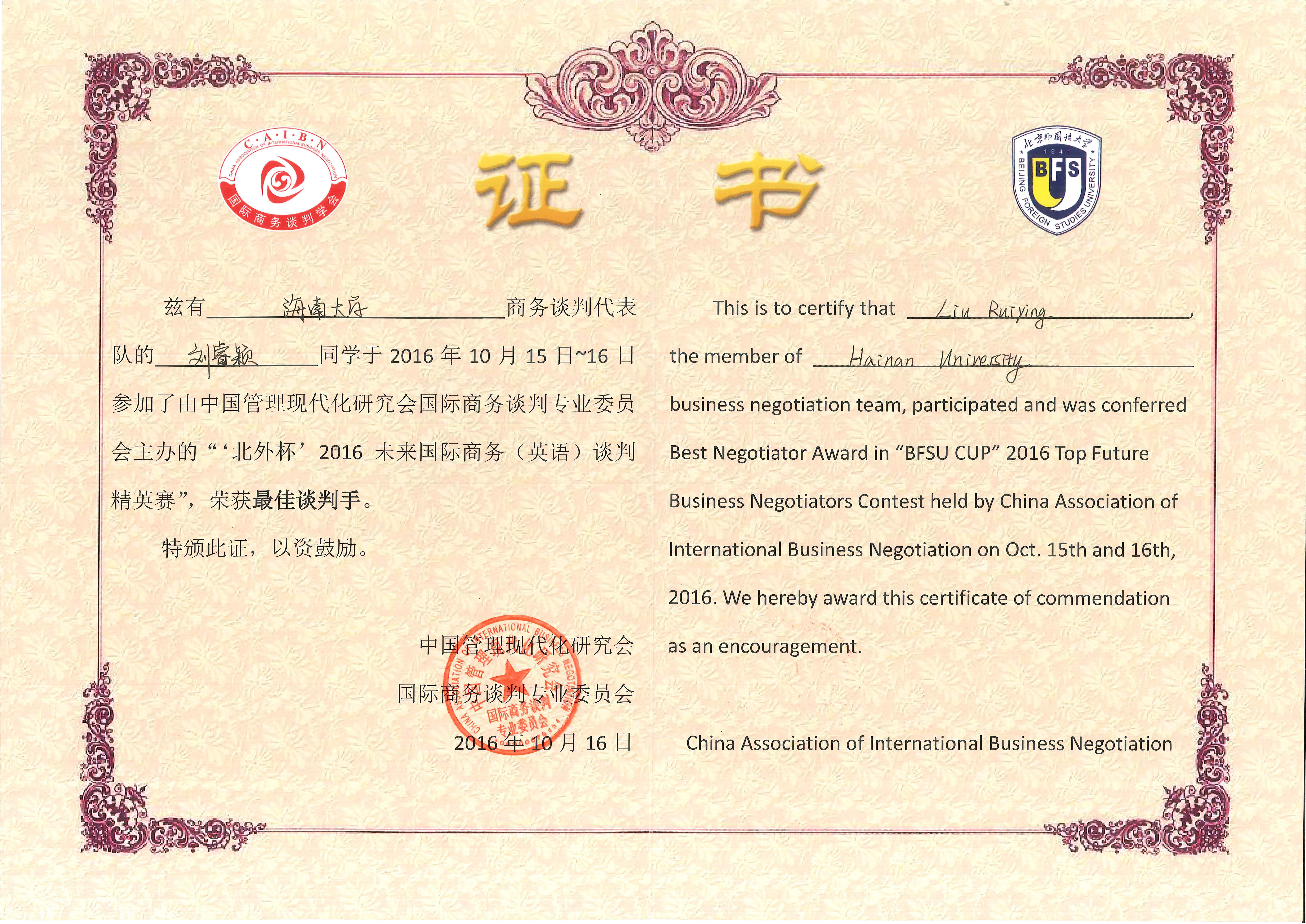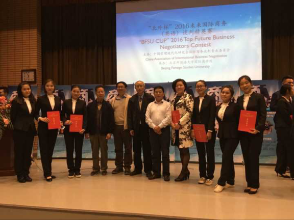 2016年10月15-16日,在北京外国语大学举行的“北外杯”2016未来国际商务(英语)谈判精英赛中,由bevitor伟德李润珍老师带队的BEVITOR伟德代表队表现优异,取得了“团体一等奖”的好成绩,李润珍老师获得了“优秀指导老师”的称号,刘睿颖同学获得了“最佳谈判手”荣誉。