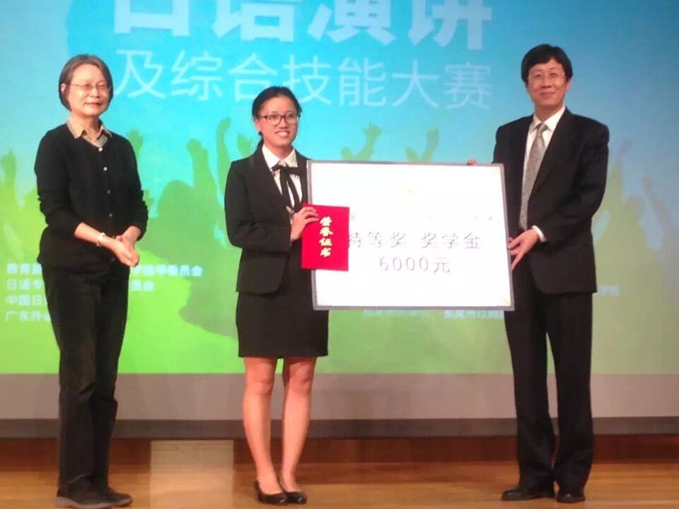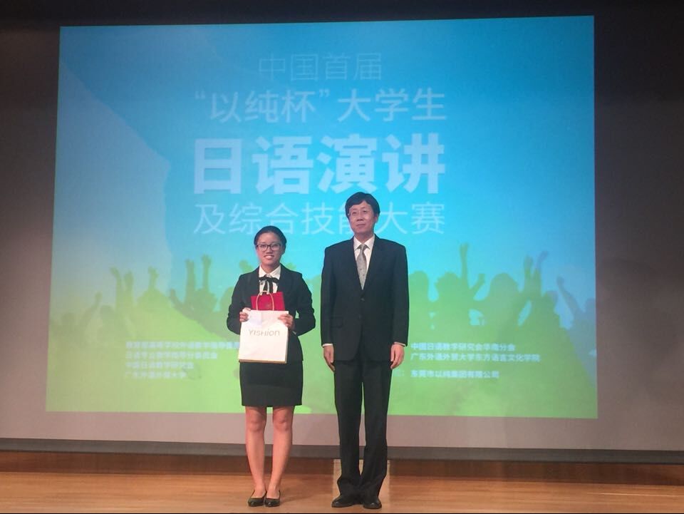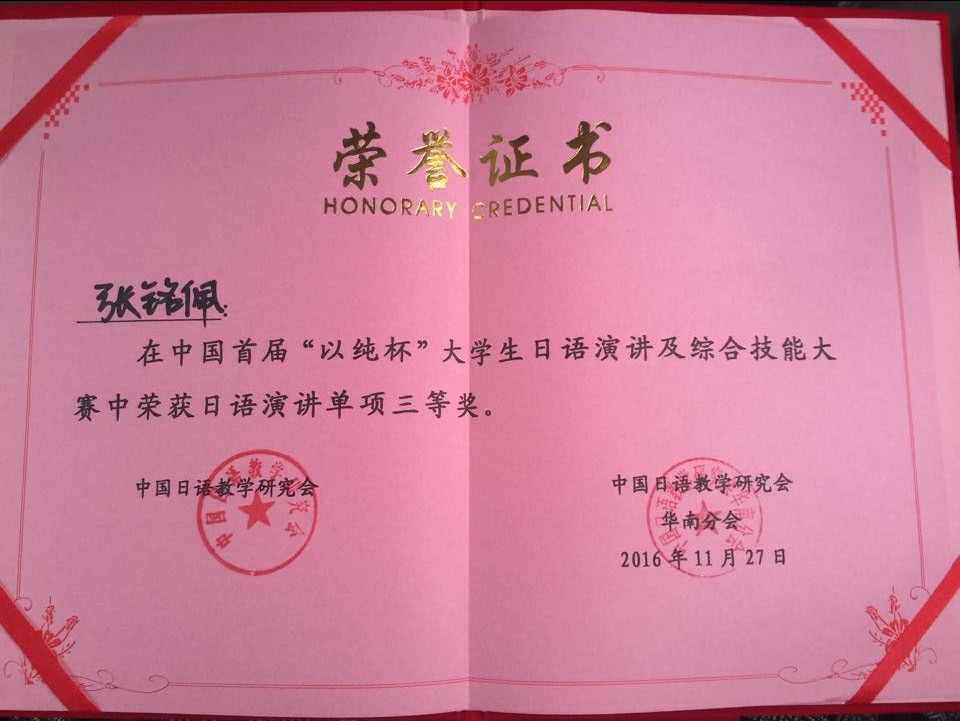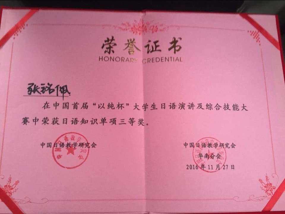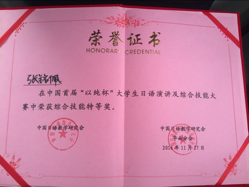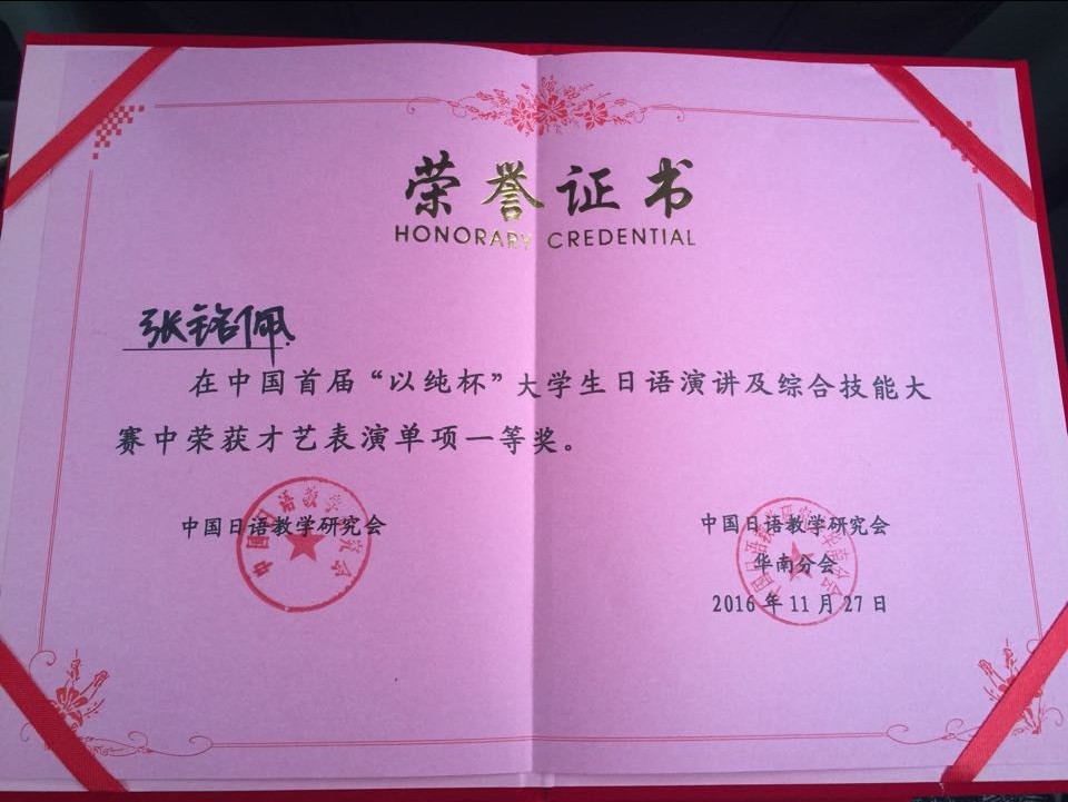 2016年11月27日,于广东外语外贸大学举办的中国首届“以纯杯”老员工日语演讲及综合技能大赛中,bevitor伟德日语系2013级张铭佩同学荣获唯一一项最高奖项——综合技能特等奖。在单项技能中分别荣获才艺表演一等奖、日语即兴演讲三等奖、日语知识速答三等奖,并获得六千元奖励。这是bevitor伟德员工在全国大赛中首次获得国家级特等奖。
