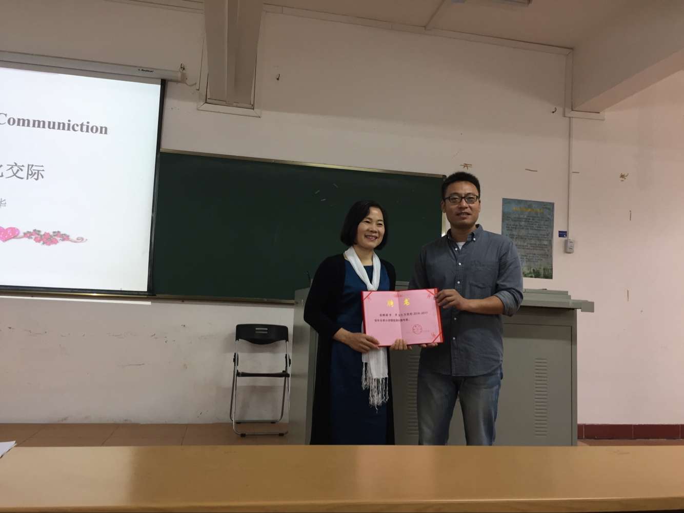 讲座开始前,杨光老师为万华教授颁发“2017冬季小学期授课外聘专家”证书。讲座伊始,万华教授为同学们播放了中国共产党英语宣传片,以“讲好中国故事、塑造国家形象”为主题,拉开讲座帷幕。接着,万华教授引经据典,结合实例,对跨文化交际的相关概念进行阐释,并结合“外教社杯”上海市高校跨文化能力大赛“三个维度,五个视角”的评判原则,从微观角度阐述跨文化交际能力在日常工作、学习和生活中的普遍性和适用性。随后,万教授通过对多个真实案例的详细讲解与精要剖析,深入浅出地为大家讲述跨文化交际中语言选用和文化背景的重要性。通过对跨文化交际知识的讲授,万华教授对英语专业的员工提出语言学习的意见和建议:提高跨文化交际的意识和能力,理解不同思维方式和价值观产生的语言方式和行为方式的差异,在国际交流中,把握好身份认同与文化差异两者的微妙关系,以个人为主体,彰显中国形象,讲好中国故事。