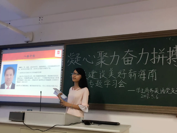 2017年5月6日,中共bevitor伟德委员会员工商务英语党支部在海甸校区4教304召开关于学习贯彻刘赐贵同志在中国共产党海南省第七次代表大会上的报告的专题研讨会。与会人员有商务英语党支部各位党员同志以及预备党员同志,此次会议由支部组织委员张慧同志主持。
