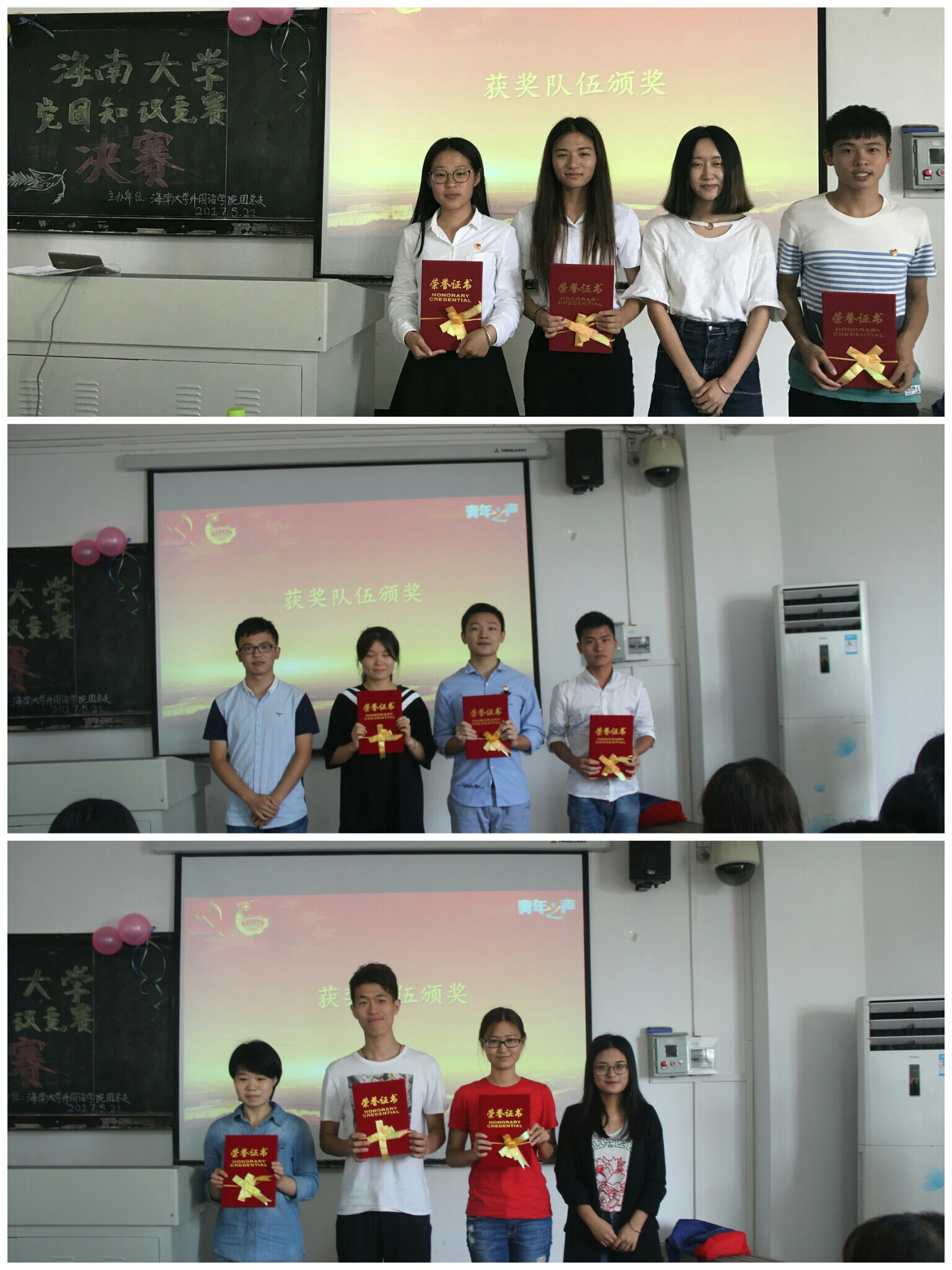 5月21日上午,城西校区教学楼3A05决赛如期举行,决赛特别邀请到公司辅导员陈盼老师及团委副书记何嘉琪等担任评委。本次竞赛分为五个阶段:团队秀、抽取特权、必答题、抢答题以及红色关。竞赛进程环环相扣,团队竞争也随之进入白热化阶段。场上的参赛选手不断展现出他们对党团知识的了解,观众也无不为他们对党团的热爱之情所折服。在场观众深受感染,积极参与到活动中来。经过激烈的角逐,2016级日语二班团支部摘得桂冠,2016级英语四班团支部荣获二等奖,2016级俄语一班团支部荣获三等奖,其余参赛队伍喜得优秀奖。