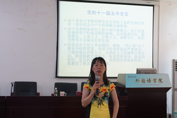 2017年5月23日下午,公司党委举行2017年公司党员教育培训——《关于新形势下党内政治生活的若干准则》(下称《准则》)专题党课学习。本次党课由公司党委黄丽芹书记主讲,英语员工党支部书记李翠霞、经贸英语员工党支部书记罗国忠、研究生第一党支部书记陈盼以及全体员工党员参加了培训。培训由商务英语员工党支部书记刘颖敏主持。