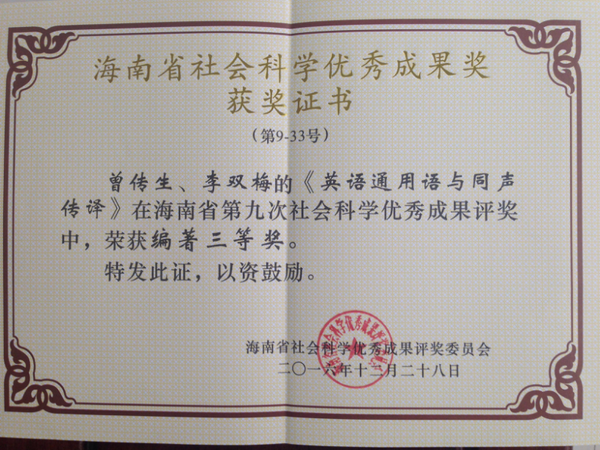 5月23日下午,海南省第九次社会科学优秀成果奖颁奖大会在海口举行。公司金山教授的《占领期日本侵略者对海南岛的文化渗透》、曾传生、李双梅副教授的《英语通用语与同声传译》分别荣获论文二等奖和编著三等奖。