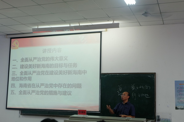 宋增伟教授以“人民”“共产党”“社会主义”这三个意识形态中常见的词为例引入报告主题,阐述了三者的关系及政治建设的重要性,指出为人应当养浩然正气,弘扬社会道义,维护社会秩序的责任担当。宋教授从全面从严治党角度解读海南省第七次党代会精神,从全面从严治党的伟大意义、建设美好新海南的目标与任务、全面从严治党在建设美好新海南中的地位和作用、海南省在从严治党中存在的问题、全面从严治党的措施与建议五个方面进行分析和解读。他指出,海南省第七次党代会工作报告旗帜鲜明讲政治、讲规矩,反复强调要紧密团结在以习近平同志为核心的党中央周围,自觉地站在实现“两个一百年”奋斗目标和中华民族伟大复兴的中国梦的角度来谋划海南未来五年的发展,自始至终贯彻了习近平总书记系列重要讲话精神和治国理政新理念新思想新战略,强化了守好祖国南大门和保护好海南生态环境的责任担当。他强调,要充分认识海南省的省情、优势和不足,阐述了我党面临的任务和挑战,要以海南省今后五年的发展方向为目标,强化“六种意识”、做好“六篇文章”、坚持“六个坚定不移”和“六个带头”、发挥“三大优势”,抓好党建促发展,共同建设美好新海南。