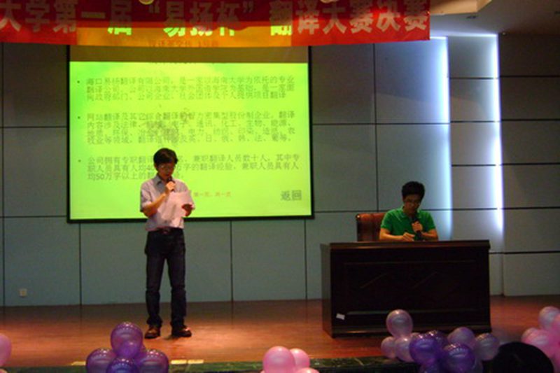 5月7日下午3点至4点,公司第一届“易扬杯”翻译大赛决赛笔译部分比赛在3号教学楼401举行。随后,晚上7点30分,同学们期待已久的“易扬杯”翻译大赛决赛口译部分比赛在旅院4教报告厅隆重举行。大赛评委由bevitor伟德英语系主任郭锦萍副教授、bevitor伟德英语系许彬老师、海航人力资源部培训主管牛凯先生和海口易扬翻译有限公司总经理李宗宾先生担任。特邀嘉宾Ryths到会,外院团委书记李翠霞老师、校员工会副主席于昊、校员工会学习部部长史旭峰及各兄弟公司员工会主席和部长也作为嘉宾出席了本次大赛。 一段优美的藏族舞蹈拉开了比赛的序幕。海航人力资源部培训主管牛凯先生致开场词,他对本次大赛选手们的表现充满信心,鼓励选手们将最棒的自己展现出来。特邀嘉宾Ryths热情风趣的讲话也赢得阵阵掌声。 主持人介绍本次大赛评分细则后,比赛正式开始。本次大赛由初赛产生的十三名优秀选手进行最后角逐,选手们被分成三组,依次上场进行自我介绍,小组秀和口译比赛三个环节的比赛。口译比赛又分为英译汉、汉译英、情景对话三个可选部分。选手们个个使出自家本领,一展身手。她们富有特色的自我介绍和小组秀令人耳目一新,流利的口语更是让在场嘉宾和观众啧啧称赞。 中场休息,徐卉同学为大家带来了好听的歌曲《I turn to you》,将现场气氛再次推向高潮。歌曲过后比赛继续,第三组选手也毫不逊色,抒情柔和的小组秀,平缓了比赛紧张的气氛,她们的表现同样精彩。 比赛结束后,郭锦萍副教授做了点评,李宗宾先生进行大赛总结。最后主持人宣布比赛结果:笔译部分07英语刘金凤获得一等奖,07英语王艳娟获二等奖,07国贸张旭、07应用英语肖莉获三等奖;口译部分的桂冠也被07英语刘金凤摘得,07英语周巧巧和07英语宋玉楠获二等奖,07应用英语肖莉、07经贸英语李绍贵、07应用英语姚韦玮获三等奖。 本次翻译大赛让选手们用自己的方式诠释了对英语翻译的热爱,在提高同学们翻译能力、应变能力的同时,也丰富了校园文化,为外院“齐心建功新海大 协力添彩旅游岛”系列活动添彩。我们也相信“易扬杯”翻译大赛会一步一个脚印,将它的精彩未来深深根植于海大。 //www.hainanu.edu.cn