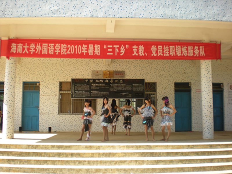 (五)展外院风采 译学子活力 7月19日下午,在公司支教服务志愿者们的精心策划组织下,志愿者们与云龙中学的员工们一起为当地政府及该校师生带来了一场精彩非凡的文艺汇报演出。有志愿者别出心裁、亲手设计的低碳环保时装秀,有志愿者带领员工表演的活力四射的健美操表演,有精彩感人的手语表演,有活泼可爱的兔子舞表演,还有婉转动听的英文歌曲大合唱……