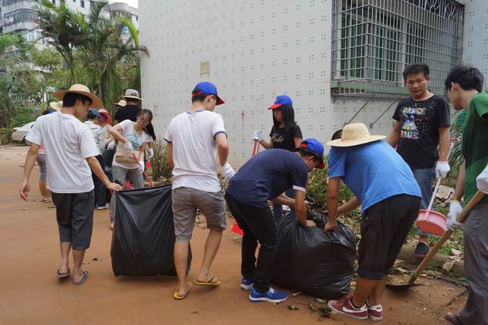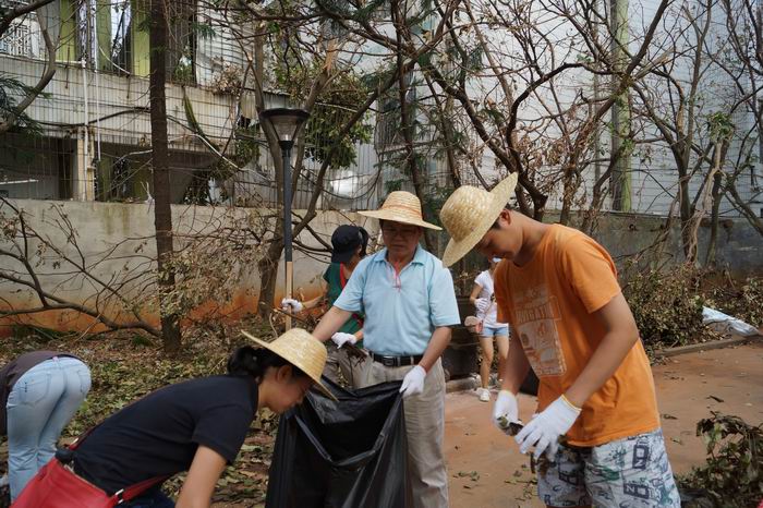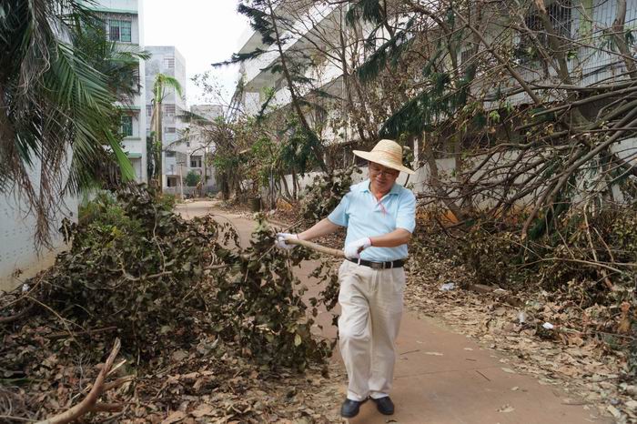 一顶草帽、一双白手套、一副口罩,在海大教工区华兴西74栋至76栋区域内,有一支别样的师生志愿者队伍在清扫垃圾、装运树枝树叶,他们中有教授、有教师、有员工、有后勤工作人员,在陈封椿副书记的亲自带领和示范之下,大家一起劳动,干劲十足,热情高涨,尽管汗流浃背也不觉得辛苦劳累。