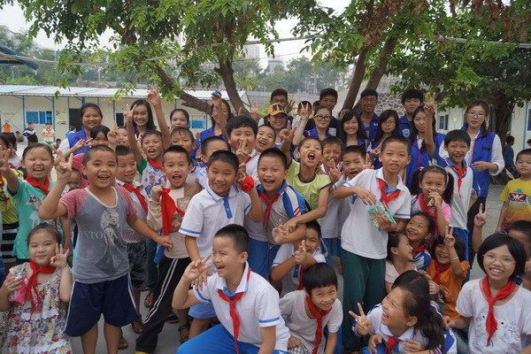 志愿者与孩子们合影